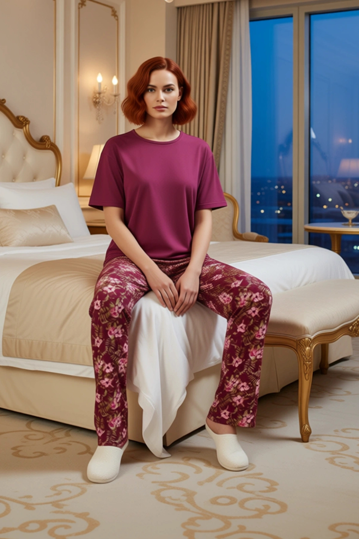 Bu kadın ev giyim takımı, bordo rengin asaletini ve çiçek desenlerinin canlılığını bir araya getirerek, evdeki zamanlarınızı daha keyifli hale getiriyor. %100 pamuklu örme kumaştan üretilen bu takım, nefes alabilen yapısı ve yumuşak dokusuyla gün boyu maksimum konfor sunar. Üst kısım, klasik bisiklet yaka ve kısa kollu tasarımıyla rahat bir kullanım sağlarken, regular kalıbı sayesinde her vücut tipine uyum sağlar. Pantolon ise aynı zarif çiçek desenini taşıyan, boru paça ve normal bel özellikleriyle tamamlanmıştır. 30/1 openend süprem dokuma tipi, kumaşın kalitesini ve dayanıklılığını artırır. Takımın bisiklet yaka detayı, boyun bölgesinde herhangi bir rahatsızlık hissi yaratmadan, doğal bir duruş sergiler. Kısa kolları, evdeki aktiviteler sırasında hareket özgürlüğünüzü kısıtlamaz. Regular kesim, vücuda tam oturmayan, rahat bir siluet sunarak evde dinlenirken veya günlük işlerinizi yaparken size eşlik eder. %100 pamuk içeriği, cildinizin nefes almasını sağlayarak terlemeyi önler ve gün boyu ferah bir his verir. Mix baskı tekniğiyle işlenen çiçek desenleri, takımın estetik çekiciliğini artırarak, ev giyiminde de stil sahibi olmanızı sağlar. Bu şık pijama takımı, özellikle ilkbahar ve sonbahar aylarında tercih edilebilir. Evde rahat bir gün geçirmek için bu takımı, yumuşak bir terlik veya ev ayakkabısı ile tamamlayabilirsiniz. Daha dışarıya dönük bir kullanım için, üzerine salaş bir hırka alıp rahat bir jean pantolon ile de kombinleyebilirsiniz. Takımın bakımında, renklerin canlılığını ve kumaşın dokusunu korumak için ters çevirerek ve benzer renklerle birlikte düşük sıcaklıkta yıkamanız önerilir.