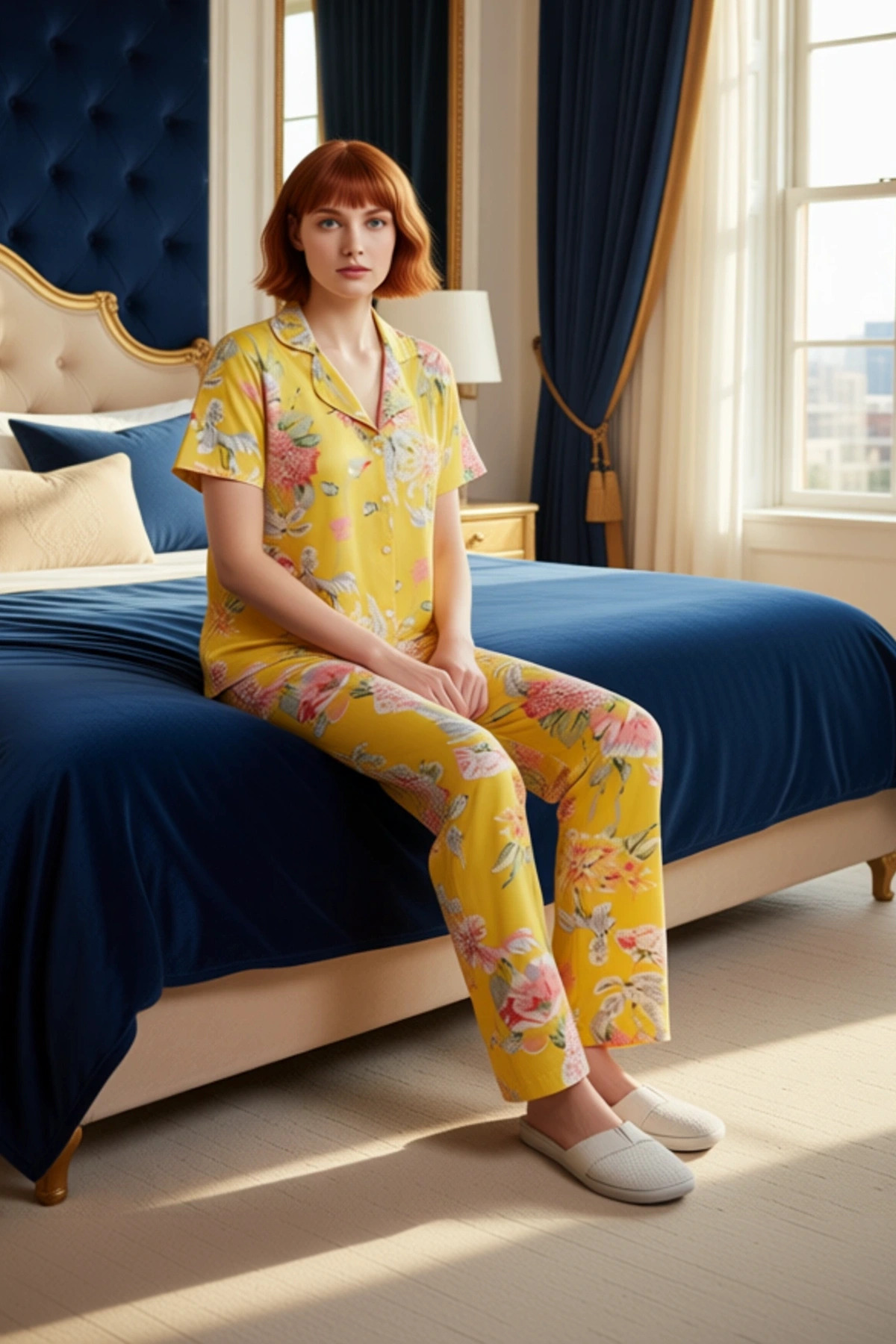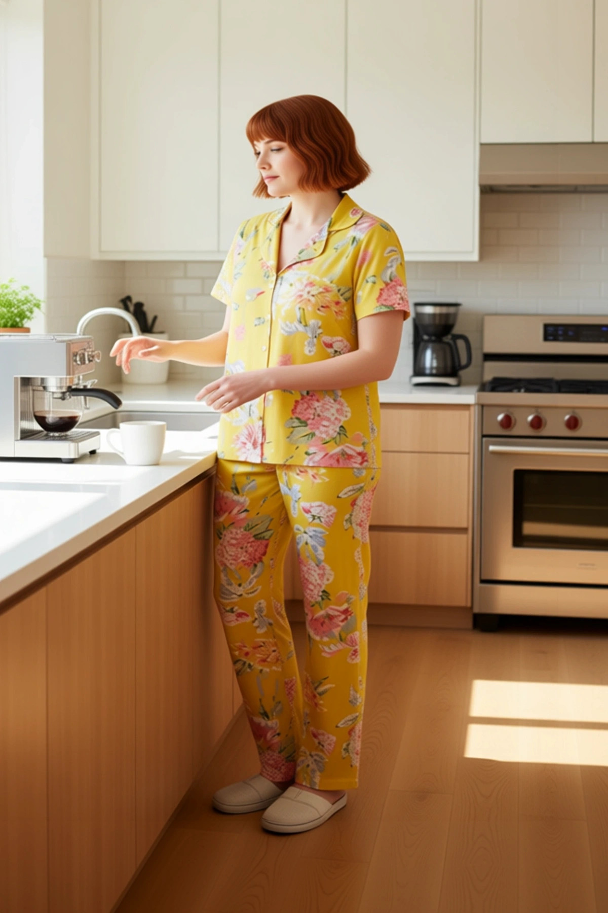 Evinizde şıklığı ve konforu bir arada yaşamak isteyen kadınlar için tasarlanan bu sarı çiçek desenli örme pijama takımı, %100 pamuk içeriğiyle cildinize dost bir dokunuş sunar. Canlı sarı zemin üzerine işlenmiş büyük ve zarif çiçek desenleri, takıma enerjik ve neşeli bir hava katıyor. Örme kumaşın sunduğu yumuşaklık ve nefes alabilirlik, günün her anında maksimum konfor sağlar. Gömlek yaka ve kısa kollu üst, klasik bir pijama görünümünü modern bir stil ile birleştirirken, uzun ve boru paça pantolon ise hareket özgürlüğünüzü kısıtlamadan rahat bir kullanım sunar. Regular kalıbı sayesinde her vücut tipine uyum sağlayan bu takım, ev giyiminde stil sahibi olmanızı kolaylaştırır. Bu pijama takımı, hem gündelik kullanım hem de özel anlarınızda size eşlik edecek şık bir alternatiftir. Bu pijama takımının örme kumaşı, cildinizde ipeksi bir his bırakırken, yüksek pamuk oranı sayesinde hava geçirgenliği de yüksektir. Gömlek yaka tasarımı, klasik bir görünüm sunarken, kısa kollu üst, özellikle sıcak günlerde serin kalmanıza yardımcı olur. Pantolonun boru paça kesimi, rahat hareket etmenizi sağlarken, uzunluğu ise tam bir kapsama alanı sunar. Regular kalıp, vücudunuzu sıkmadan rahat bir oturuş sağlar. Süprem dokuma tipi, kumaşın dokusunu zenginleştirir ve dayanıklılığını artırır. Bu pijama takımı, evdeki yaşam kalitenizi artırmak ve kendinizi iyi hissetmenizi sağlamak için özenle tasarlanmıştır. Gündelik kullanım için de ideal olan bu takım, ev giyiminde konfor ve şıklığı bir arada arayanlar için mükemmel bir seçenektir. Bu çiçek desenli pijama takımı, her mevsim için uygun bir seçenektir. Özellikle bahar ve yaz aylarında hafifliği ile öne çıkar. Bu şık takımı, evde rahatça giyebileceğiniz yumuşak terlikler veya babetlerle tamamlayabilirsiniz. Hafta sonu evde dinlenirken veya sabah kahvenizi yudumlarken bu takımı tercih edebilirsiniz. Takımın bakımı oldukça pratiktir; makinede yıkanabilir ve düşük ısıda ütülenebilir. Bu sayede pijama takımınızın canlılığını ve formunu uzun süre koruyabilirsiniz. Ev giyiminde hem rahatlığı hem de estetiği bir arada sunan bu sarı çiçek desenli örme pijama takımı, size keyifli ve huzurlu anlar yaşatacaktır.