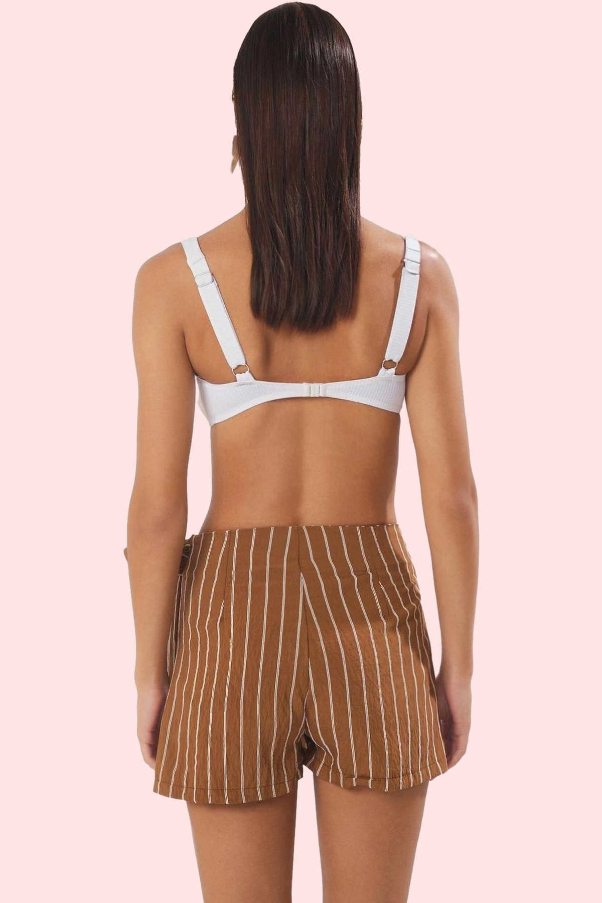 Bu çarpıcı yüksek bel şort etek, yaz aylarında plaj stilinizi tamamlamak için mükemmel bir seçim. Kahverengi çizgili deseni ve bağlama detayı ile göz alıcı bir görünüme sahip. Rahat ve nefes alabilir dokuma kumaşı, gün boyu konfor sağlar. Hem şık hem de pratik olan bu etek, yazın vazgeçilmez parçanız olacak.
