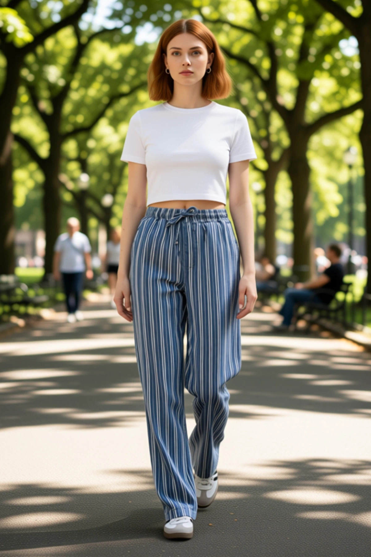 Bu bol kesim pantolon, modern ve rahat bir stil arayan kadınlar için tasarlandı. Geniş paça ve yüksek bel detayı, güncel moda akımlarını yansıtıyor. Materyal bileşimi %76 pamuk, %12 keten ve %12 viskozdan oluşmaktadır. Bu karışım, kumaşa hem dayanıklılık hem de yumuşak bir dokunuş kazandırırken, aynı zamanda nefes alabilirliği ile de öne çıkıyor. Pantolonun üzerindeki belirgin dikey çizgili mavi desen, klasik bir görünümü çağdaş bir yorumla birleştiriyor. Bu desen, her vücut tipine uyum sağlayabilen ve stilinize zarif bir dokunuş ekleyen bir özellik taşıyor. Pantolonun kalıbı, rahatlığı ön planda tutan geniş paça olarak tasarlanmıştır, bu da hareket özgürlüğünüzü kısıtlamaz. Pantolonun yüksek bel özelliği, vücudunuzun üst kısmını daha uzun göstererek zarif bir siluet yaratır. Geniş paça kesimi ise rahat bir kullanım sunarken, aynı zamanda şık bir görünüm elde etmenizi sağlar. Bel kısmında bulunan ayarlanabilir büzgü ipi, pantolonun belinize tam oturmasını sağlarken, stilinize sportif bir detay ekler. Kumaşın dokuma tipi rigid (sert) olsa da, keten ve viskozun varlığı sayesinde yumuşak bir his ve dökümlü bir duruş elde edilir. Bu pantolon, günlük kullanım için ideal bir seçimdir; rahatlığı ve şıklığı bir arada arayan kadınlar için mükemmel bir parçadır. Hem evde dinlenirken hem de dışarıda aktif bir gün geçirirken rahatlıkla tercih edilebilir. Bu pantolon, özellikle yaz aylarında serin tutan yapısıyla konforlu bir kullanım sunar. KOMBİN ÖNERİSİ olarak, basic bir t-shirt veya ince triko ile tamamlayarak hafta sonu stilinizi oluşturabilirsiniz. Ayakkabı olarak beyaz spor ayakkabılar veya espadriller tercih edilebilir. Daha şık bir görünüm için ise ipek bir bluz ve topuklu sandaletlerle kombinleyerek akşam yemeği veya özel bir davet için uygun bir stil yaratabilirsiniz. Pantolonun bakımında, kumaşın dokusunu korumak için düşük sıcaklıkta hassas yıkama yapılması önerilir. Ağartıcı maddelerden kaçınılmalıdır.