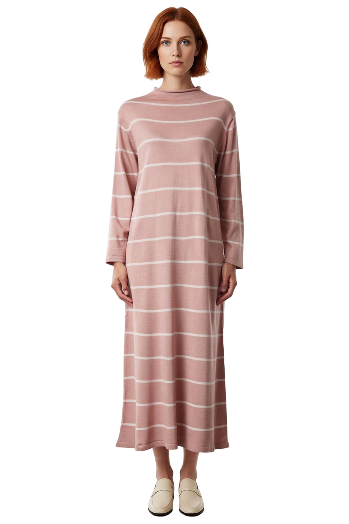 Ürün Özellikleri: A-line kalıp, akrilik materyal, çizgili desen, dik yaka, standart kol, triko kumaş, gül kurusu renk.