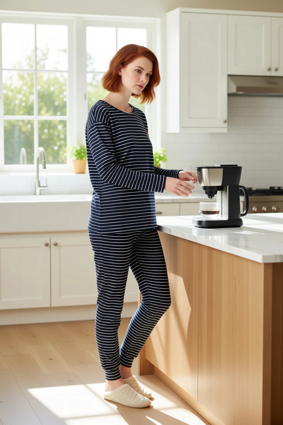 Bu şık pijama seti, kadınlar için özel olarak tasarlanmış olup, lacivert ve beyazın klasik uyumunu taşıyan çizgili deseniyle dikkat çekiyor. Üst kısmında yer alan renkli gökkuşağı baskısı, sete eğlenceli ve pozitif bir hava katıyor. %96 viskoz ve %4 elastan içeren örme kumaş, hem yumuşaklığı hem de hafif esnekliği ile gün boyu üst düzey bir konfor sunuyor. Bu materyal kombinasyonu, nefes alabilen yapısı sayesinde cildinizin rahat etmesini sağlarken, elastan oranı da hareketlerinizi kısıtlamadan rahat bir kullanım vadediyor. Süprem dokuma tipi, kumaşın pürüzsüz ve dayanıklı olmasını sağlıyor, bu da takımın uzun yıllar boyunca ilk günkü görünümünü korumasına yardımcı oluyor. Takımın uzun kollu ve uzun silüeti, özellikle serin kış gecelerinde sıcaklık ve rahatlık sağlıyor. Çizgili desen, zamansız bir moda ikonu olarak kabul edilirken, gökkuşağı detayı ise kişisel stilinizi yansıtmak için ideal bir unsur olarak öne çıkıyor. Takımın bisiklet yaka kesimi, rahat bir kullanım sunarken, standart kol yapısı günlük aktivitelerinizde özgürce hareket etmenize olanak tanır. Geniş paçalı pantolon, ev içinde rahat bir dolaşım sağlarken, yumuşak kumaşı cildinize nazik bir dokunuş sunar. Bu pijama seti, sadece uyku zamanı için değil, aynı zamanda evde geçirdiğiniz dinlenme anlarında da şıklığınızdan ödün vermemeniz için tasarlandı. Viskozun ipeksi dokusu ve elastanın sağladığı hafif esneklik, bu takımın vazgeçilmez bir parçanız olmasını sağlayacak. Regular kalıbı, vücuda tam oturmayan ancak hoş bir dökümü olan bir yapı sunarak, hem rahat hem de estetik bir görünüm sağlıyor. Gökkuşağı baskısı, bu sıradan pijama takımını daha dikkat çekici ve kişisel bir hale getiriyor. Kış mevsiminin soğuk günlerinde sizi sıcacık tutacak bu pijama takımı, evdeki konforunuzu artıracak. Bu seti, rahat bir tayt, yumuşak ev ayakkabıları ve üzerine alacağınız bol bir hırka ile kombinleyerek hafta sonu stilinizi tamamlayabilirsiniz. Ayrıca, evde film izlerken veya kitap okurken de bu takımı tercih edebilirsiniz. Takımın bakımı oldukça pratiktir; düşük sıcaklıkta elde veya makinede yıkanması, uzun süreli kullanımını destekler. Viskoz içeriği sayesinde renklerin canlılığı ve kumaşın dokusu zamanla bozulmaz.