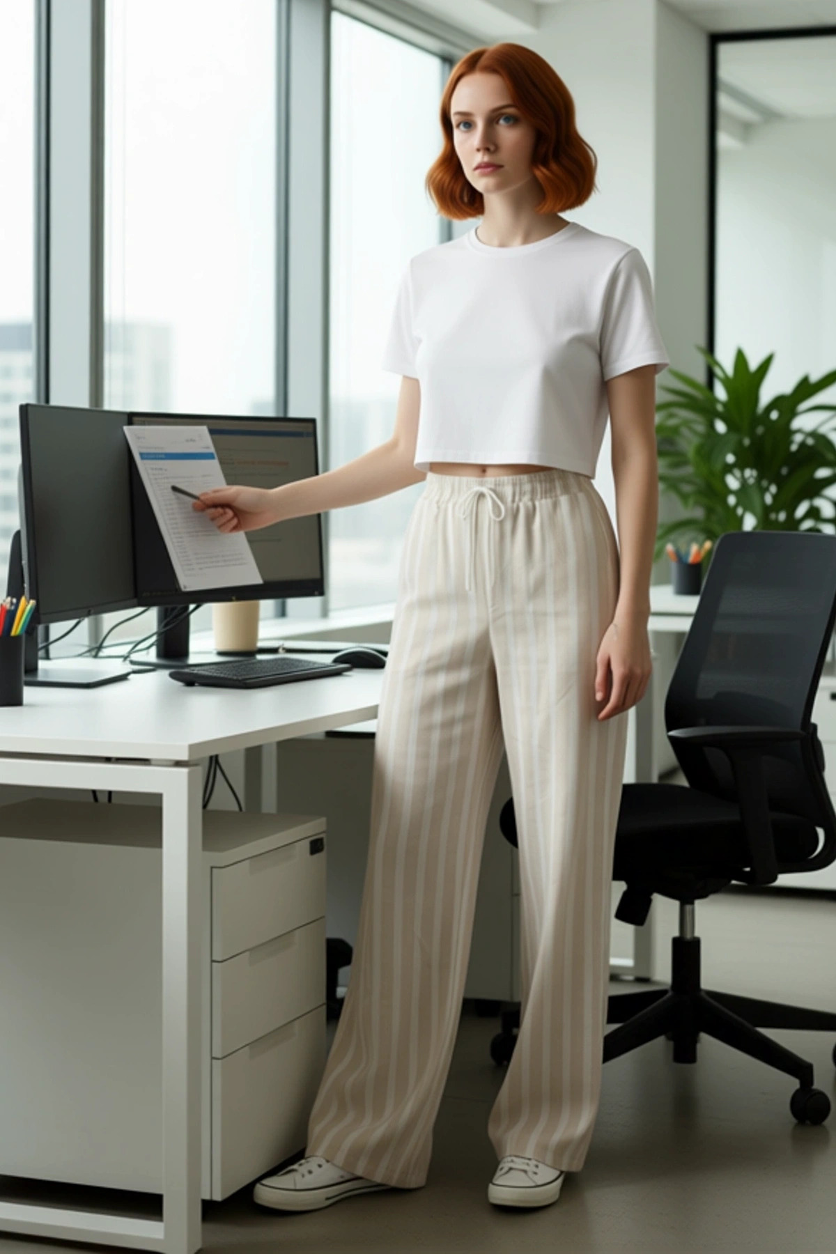 Kadınlar için özel olarak tasarlanmış bu bej çizgili pantolon, keten dokusuyla yaz gardıroplarının olmazsa olmazı olacak. %100 pamuk materyali sayesinde cildinize nazikçe dokunur ve gün boyu ferahlık hissi verir. Geniş paça kesimi, modern ve rahat bir siluet sunarken, yüksek bel detayı zarif bir görünüm sağlar. Çizgili deseni, klasik şıklığı modern bir yorumla birleştirir. Bej rengi, her türlü renk ve desenle kolayca uyum sağlayarak çok yönlü bir kullanım imkanı sunar. Casual ve günlük kullanım için ideal olan bu pantolon, cool ve konforlu bir stil arayan kadınlar için mükemmel bir seçenektir. Uzun boyu ve geniş paçaları ile hareket özgürlüğü sunan bu parça, hafifliği ile de öne çıkar. Dokuma kumaşın verdiği doğal görünüm, pantolona sofistike bir hava katar. Bu pantolon, şıklığı ve rahatlığı bir arada arayan her kadının beğenisini kazanacaktır. Bu pantolonun öne çıkan özelliklerinden biri, yüksek bel kesimidir. Bu kesim, vücut oranlarını dengeleyerek daha uzun ve ince bir görünüm elde etmenizi sağlar. Geniş paça ise, gün boyu hareket özgürlüğü sunarak konforunuzu en üst düzeye çıkarır. %100 pamuk kumaşın nefes alabilen yapısı, özellikle sıcak havalarda serin kalmanıza yardımcı olur. Lastikli bel detayı, pantolonun bedeninize tam oturmasını sağlarken, giyip çıkarma kolaylığı da sunar. Çizgili deseni, pantolona zamansız bir şıklık katarken, keten görünümlü dokusu ise doğal ve zarif bir estetik sunar. Bu pantolon, hem günlük hayatta hem de özel günlerde rahatlıkla tercih edilebilecek bir parçadır. Yaz aylarında serin ve şık kalmak için bu pantolonu tercih edebilirsiniz. Beyaz bir tişört, ince triko bir kazak veya basic bir askılı bluz ile kombinleyebilirsiniz. Altına beyaz spor ayakkabılar, hasır sandaletler veya şık terlikler giyerek tamamlayıcı bir görünüm elde edebilirsiniz. Aksesuar olarak ince bir kolye veya bileklik ile stilinizi zenginleştirebilirsiniz. Bu pantolonun bakımı oldukça pratiktir; soğuk su ile nazikçe yıkanması ve sererek kurutulması önerilir. Bu sayede pantolonunuzun dokusunu ve rengini uzun süre koruyabilirsiniz.
