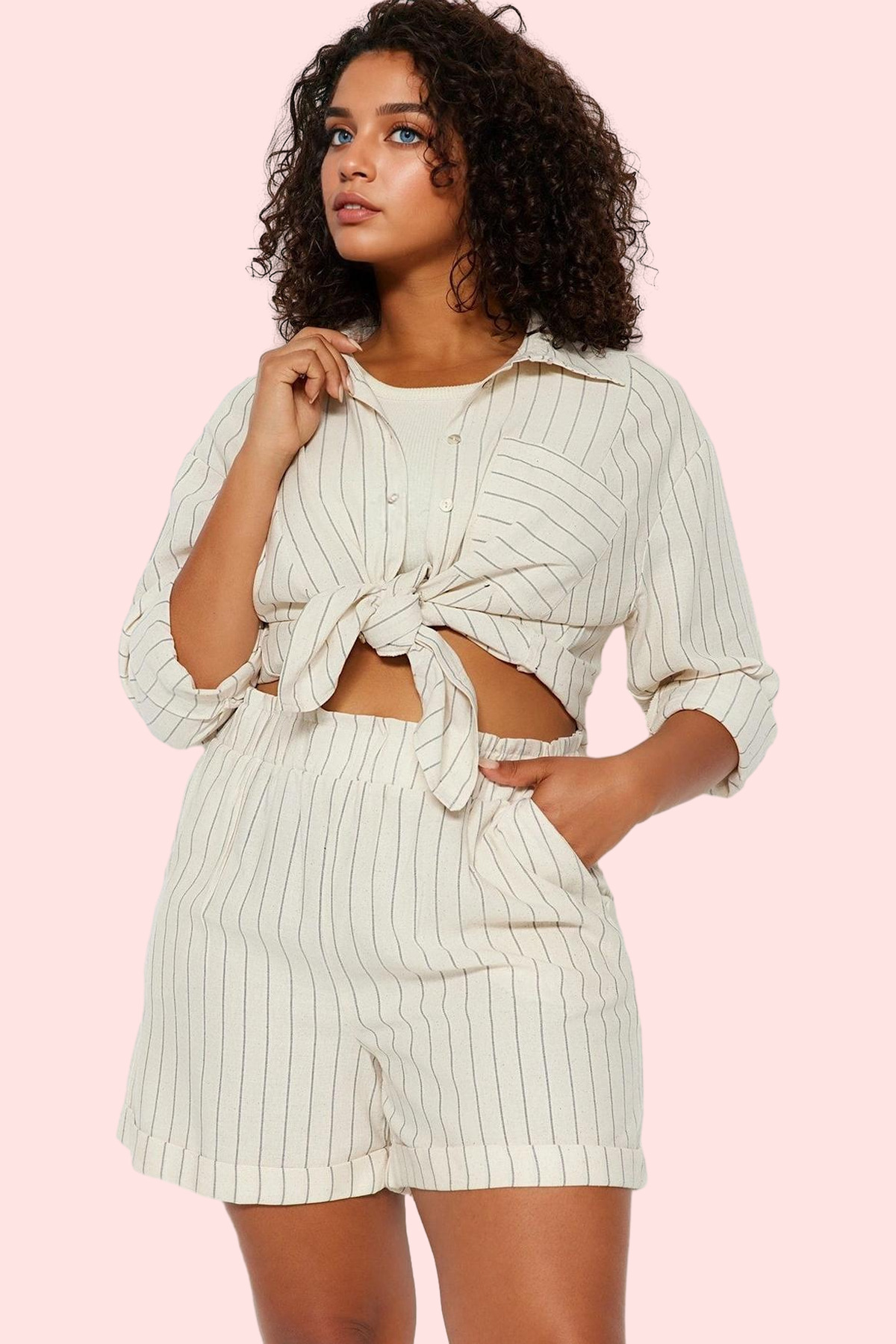 Bu yaz, rahatlığı ve şıklığı bir arada sunan bej çizgili keten görünümlü şortumuzla tanışın! Nefes alabilen pamuk-polyester karışımı kumaştan üretilen şortumuz, yaz sıcağında bile konforlu kalmanızı sağlar. Keten görünümlü dokuma yapısı ve şık çizgili deseniyle tarzınızı yansıtacağınız bu şort, günlük kombinleriniz için mükemmel bir seçim. Normal bel yüksekliği ve rahat kalıbıyla her vücut tipine uyum sağlar. Kısa boyu ve geniş paçası, özgürce hareket etmenizi sağlar. Kemersiz tasarımı ise şık ve minimalist bir görünüm sunar.