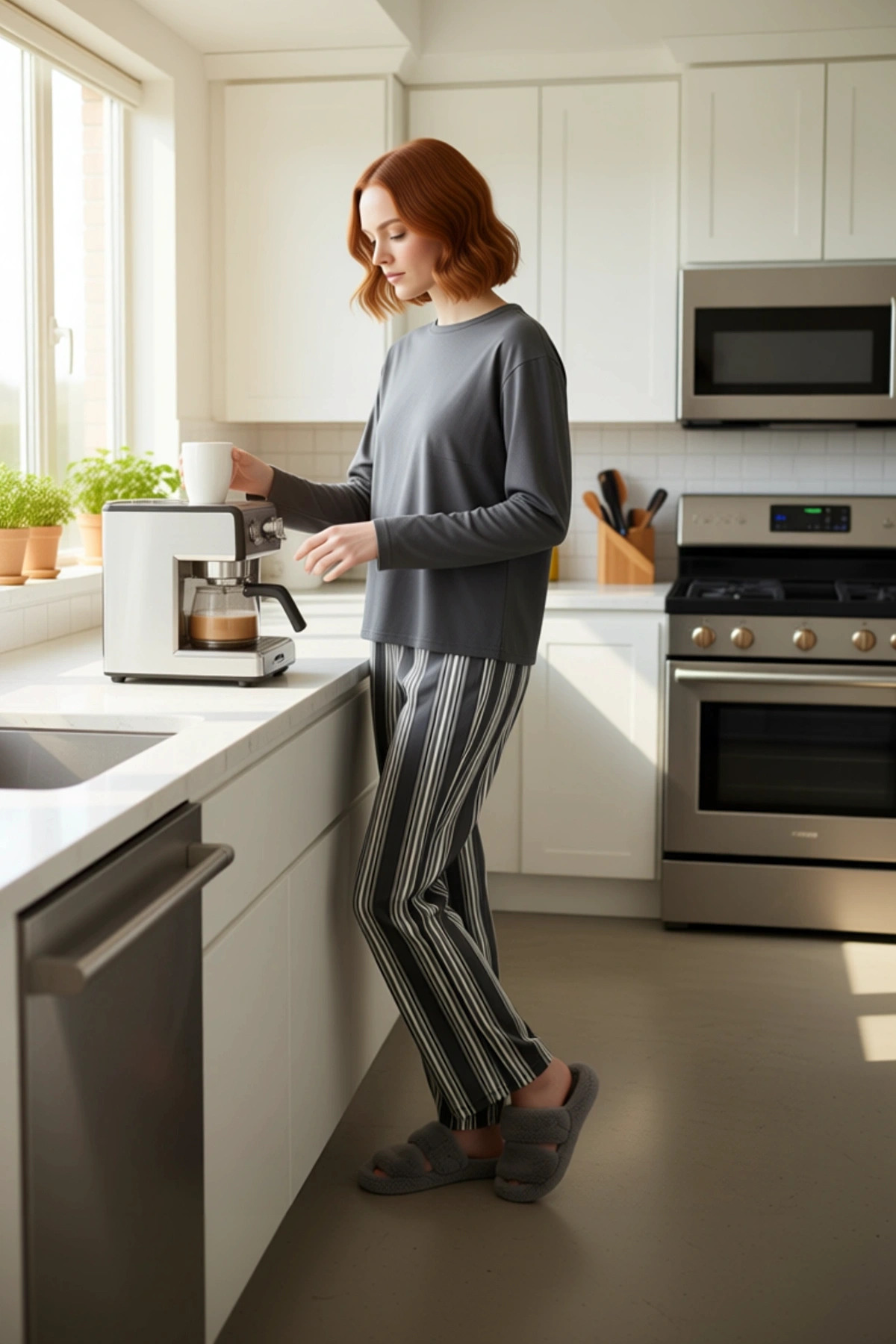 Bu şık ev giyim takımı, %100 pamuk içeriğiyle maksimum konfor sunar. Üst kısım, uzun kollu ve bisiklet yakalı olarak tasarlanmış olup, rahat bir kalıba sahiptir. Pantolon ise zarif gri ve beyaz çizgili deseniyle dikkat çeker. Regular kalıp, vücuda oturan ancak sıkmayan bir yapı sunarken, örme kumaş dokusu yumuşak bir his verir. Süprem dokuma, kumaşa ekstra bir yumuşaklık ve dayanıklılık kazandırır. Basic silueti, zamansız bir stil sunarken, cool ve konforlu persona ile uyum sağlar. Bu takım, lounge ve ev ortamları için mükemmel bir tercihtir. İki parçadan oluşan bu set, bir adet uzun kollu tişört ve bir adet boru paça pantolon içerir. Ürün, kadınlar için özel olarak tasarlanmıştır ve evde geçirilen zamanı daha keyifli hale getirmeyi amaçlar. Üst giyimde bisiklet yaka ve standart kol detayı, gün boyu rahatlık sağlarken, uzun kol boyu soğuk günlerde sıcak tutar. Pantolonun normal bel ve boru paça kesimi, hareket özgürlüğü sunar ve rahat bir kullanım deneyimi yaşatır. %100 pamuk kumaş, cildin nefes almasına izin verir ve hassas ciltler için bile uygundur. Bu özellikler, özellikle uyku sırasında konforu artırır. Mix baskı tekniği ile uygulanan çizgili desen, takıma modern bir dokunuş katarken, örme kumaşın yumuşaklığı gün boyu süren bir rahatlık sağlar. Bu pijama takımı, evde dinlenirken veya günlük ev aktivitelerinizi yaparken kendinizi iyi hissetmenizi sağlayacak şekilde özenle üretilmiştir. Kış mevsimi için ideal olan bu pijama takımı, evde geçirilen zamanı daha konforlu hale getirir. Bu takımı, pelüş ev terlikleri ve yumuşak bir hırka ile tamamlayarak şık bir ev görünümü elde edebilirsiniz. Ayrıca, evde dinlenirken veya sevdiğiniz dizileri izlerken de tercih edebilirsiniz. Takımın bakımı kolaydır; makinede yıkanabilir ve düşük ısıda ütülenebilir. Bu sayede pijama takımınızın ömrünü uzatabilir ve her zaman ilk günkü gibi kalmasını sağlayabilirsiniz. Bu ürün, Türkiye’de üretilmiştir.