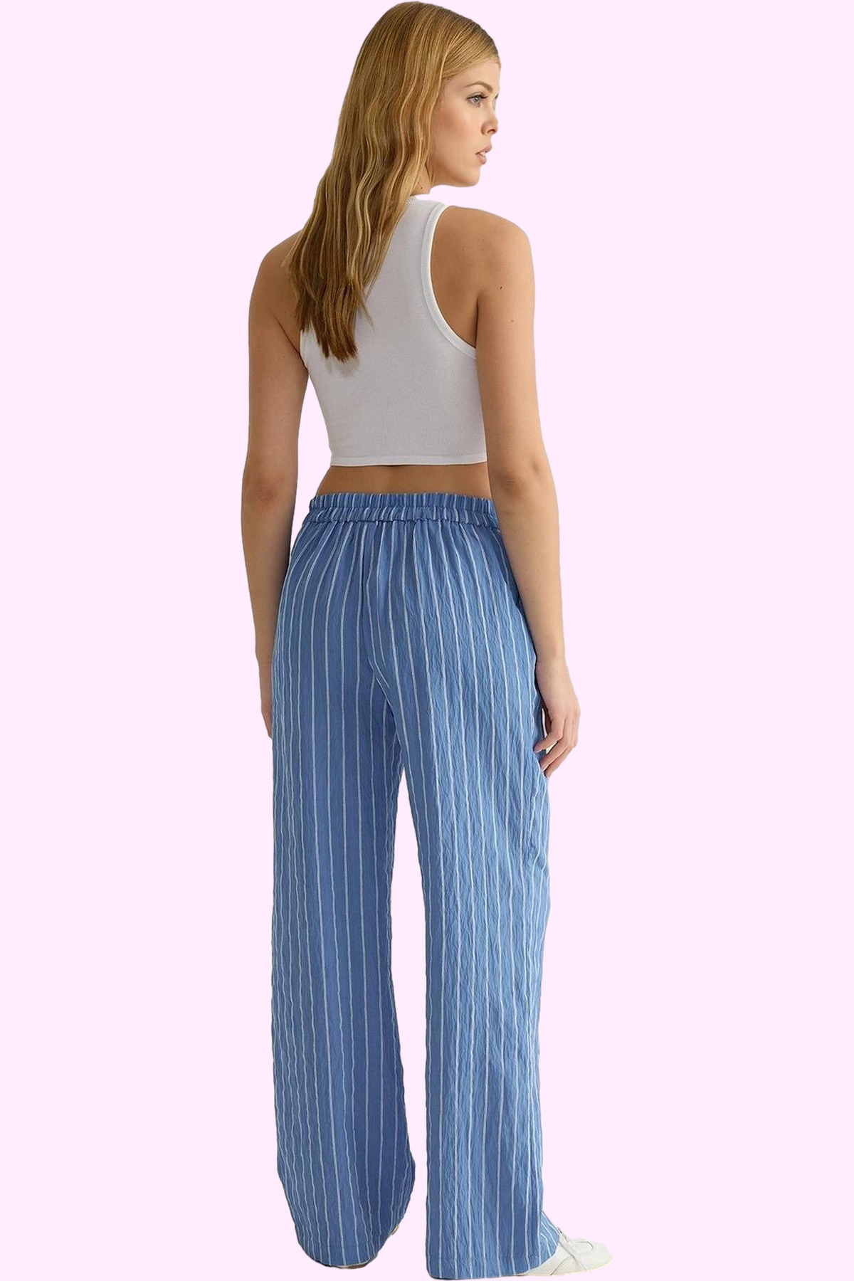 Materyal Bileşeni: %86 Viskoz, %14 Poliamid; Paça Tipi: Geniş Paça; Bel: Normal Bel; Kalıp: Wide Leg; Desen: Çizgili; Renk: Mavi; Koleksiyon: Casual / Günlük; Boy: Uzun; Siluet: Wide Leg; Dokuma Tipi: Crinkle; Kemer/Kuşak Durumu: Kemersiz; Sezon: Yaz
