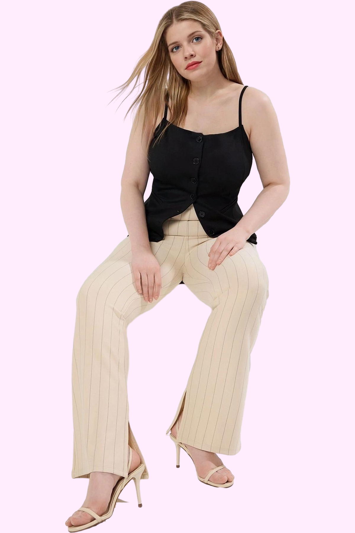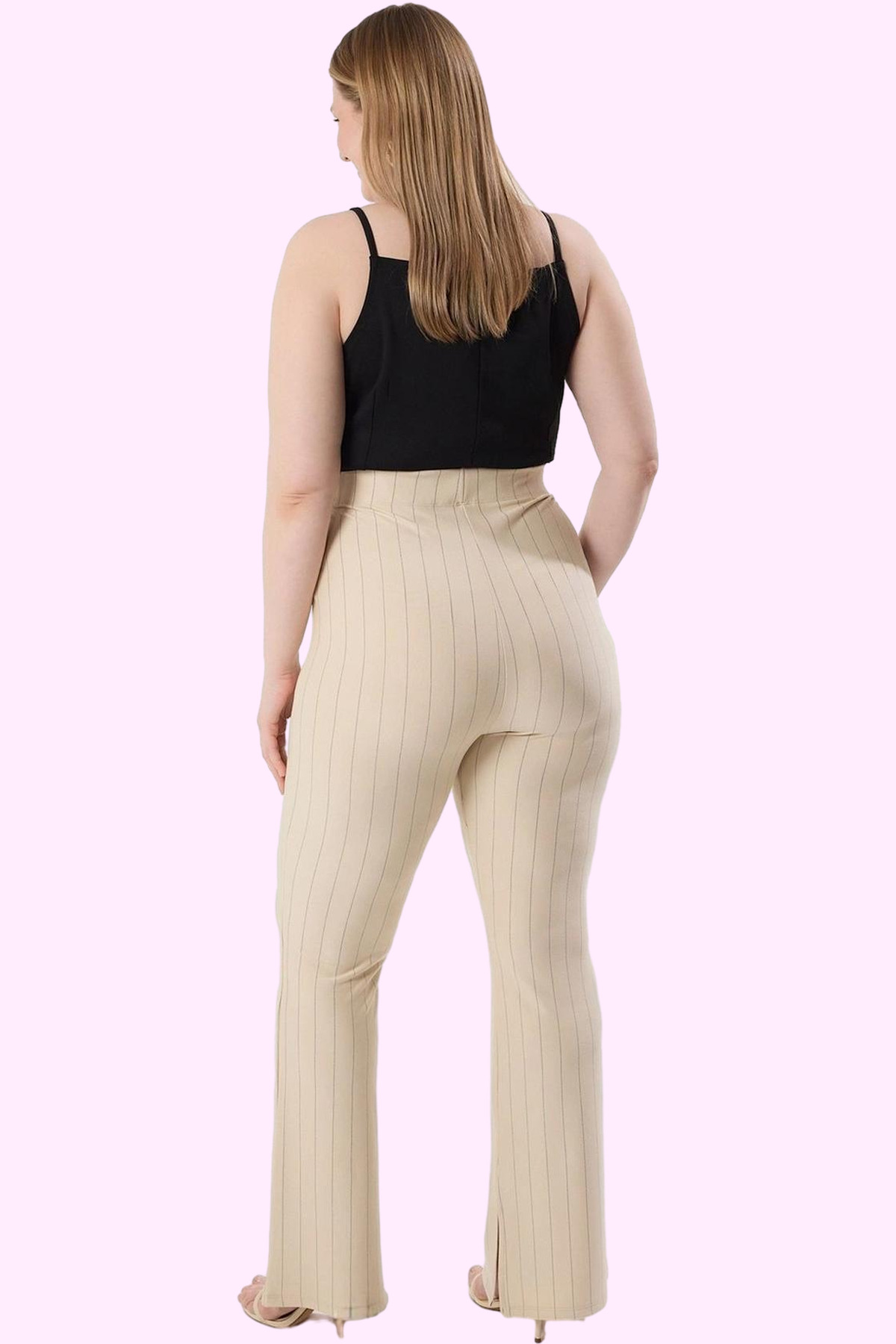 Bu sezonun en trend parçalarından biri olan bej çizgili yüksek bel flare pantolon, benzersiz tasarımı ve rahatlığı ile dikkat çekiyor. Yüksek bel kesimi ve flare paçası ile vücut hatlarınızı kusursuz bir şekilde ortaya koyarken, aynı zamanda gün boyu konfor sunuyor. %75 Polyester, %23 Viskoz ve %2 Elastan karışımından oluşan kumaşı, nefes alabilir ve yumuşak bir yapıya sahip. İnterlok dokuma tekniği sayesinde dayanıklı ve uzun ömürlüdür. Yanlardaki şık yırtmaç detayları, pantolonunuza modern bir dokunuş katıyor. Kemersiz tasarımı ile pratik ve rahat bir kullanım sunuyor. Casual tarzı ile günlük kombinlerinizin vazgeçilmezi olacak bu pantolon, farklı üstlerle kolayca kombinlenebilir. Büyük beden seçenekleriyle her vücut tipine uygunluğu ile dikkat çeker. Makinede yıkanabilir özelliği ile bakımı da oldukça kolaydır. Bej rengi ve ince çizgilerden oluşan deseni, her tarza uyum sağlayacak şekilde tasarlanmıştır.
