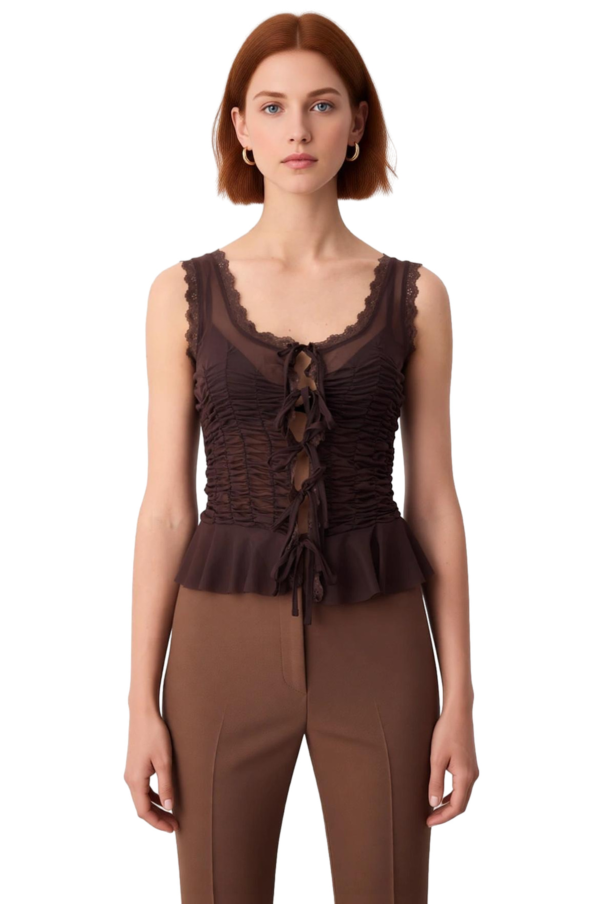Bu özel tasarım bluz, kadınların gardıroplarına zarafet ve şıklık katmak için üretilmiştir. Kare yaka kesimi, zarif bir görünüm sunarken, kolsuz yapısı sıcak günler için ideal bir kullanım sağlar. Bluzun en dikkat çekici özelliği, ön kısmındaki büzgülü detaylar ve bu detayları bir araya getiren bağcıklı kapanış sistemidir. Bu tasarım, hem estetik bir görünüm sunmakta hem de bluzun vücuda uyumunu kişiselleştirmeye olanak tanımaktadır. Ürünün tamamında kullanılan tül kumaş, hafifliği ve şeffaf dokusu ile sofistike bir hava katmaktadır. Kenarlarda yer alan ince dantel işlemeler, bluzun feminen çizgisini pekiştirerek daha zarif bir görünüm kazandırmaktadır. Bluzun kalıbı, vücudu saran bir kesime sahiptir, bu da daha belirgin ve şık bir siluet oluşturur. Örme kumaşın esnekliği, gün boyu maksimum konfor ve hareket serbestliği sunar. Bu bluz, özel davetler, partiler veya şık bir akşam yemeği için mükemmel bir tercihtir. Farklı etek, pantolon veya şort modelleri ile kolayca kombinlenebilen bu parça, çok yönlü bir kullanım sunar. %95 polyester ve %5 elastan içeriği, ürünün uzun ömürlü olmasını ve formunu korumasını sağlar. Bakımı kolay olan bu bluz, her kadının zevkine hitap edecek modern ve şık bir parçadır. Bu ürün, Türkiye’de üretilmiştir ve tüm sezonlarda rahatlıkla kullanılabilir.