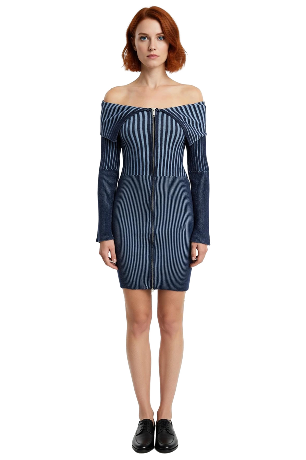 Kendine güvenen kadınların tercihi olan bu degrade çizgili triko mini elbise, bodycon kalıbıyla vücut hatlarınıza kusursuz bir uyum sağlar. Özel olarak seçilmiş viskoz karışımlı materyali, cildinize nazik bir dokunuş sunarken, gün boyu süren konforu garanti eder. Elbisenin mavinin farklı tonlarını barındıran degrade çizgili deseni, dinamik ve modern bir görünüm kazandırır. Ön kısmında yer alan fermuar detayı ve omuzları açıkta bırakan tasarımıyla fashion forward bir stilin anahtar parçasıdır.