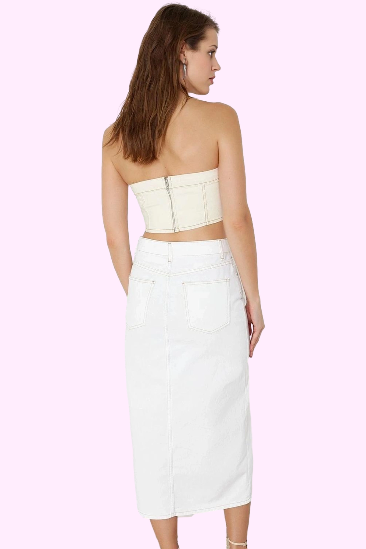 Günlük şıklığınıza ve iş hayatınızdaki zarif tarzınıza mükemmel bir tamamlayıcı olan bu beyaz denim midi etek, gardırobunuzun en çok seveceğiniz parçalarından biri olacak. %100 pamuktan üretilen etek, yumuşak ve rahat dokusuyla gün boyu konfor sunarken, A-line kalıbı ve midi boyuyla her vücut tipine ve ortama uyum sağlayacak. Öndeki şık yırtmaç detayı, hareket özgürlüğünüzü sağlarken, modern ve feminen bir tarz yaratmanıza yardımcı olacak. Cepsiz tasarımıyla minimalist bir şıklık sunan etek, her türlü üst giyimle kolayca kombinlenebilecek.
