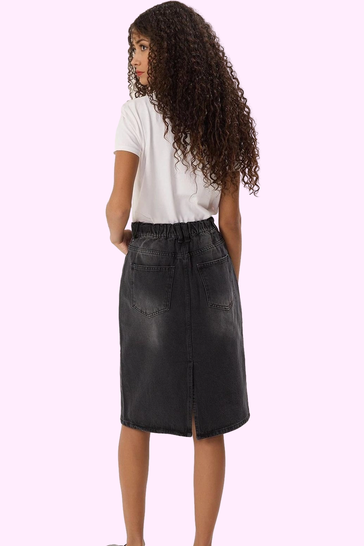 Kumaş Tipi: Denim, Renk: Siyah, Boy: Midi, Kalıp: A-line, Ürün Detayı: Yırtmaçlı, Materyal Bileşeni: 100% Pamuk, Ortam: Casual/Günlük, Siluet: A-line, Desen: Düz, Dokuma Tipi: Rigid, Sürdürülebilirlik Detayı: Evet, Yıkama Talimatı: T18, Sezon: İlkbahar / Sonbahar, Menşei: TR