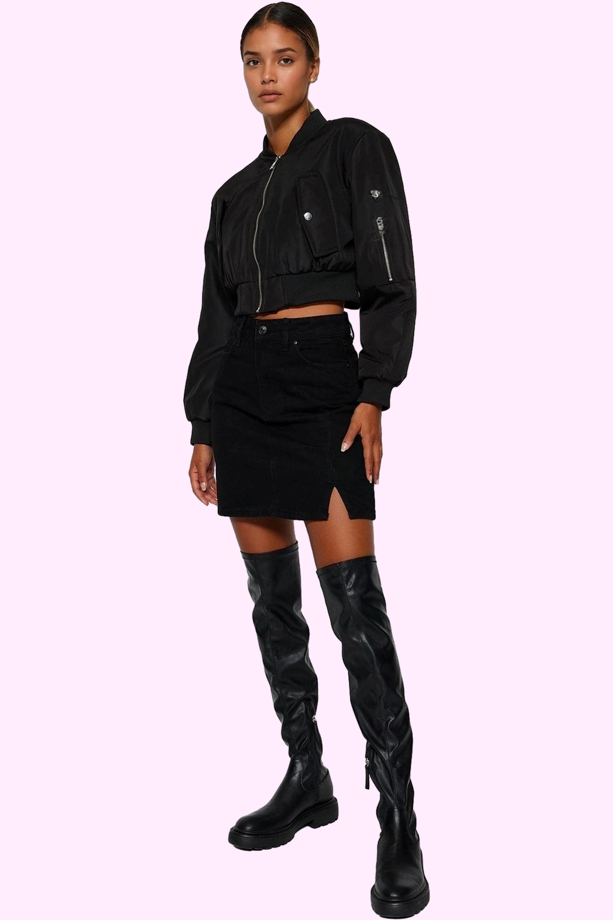 Bu sezonun trend siyah mini denim eteğiyle tanışın! Yüksek bel tasarımı ve modern A-line kalıbıyla, her vücut tipine mükemmel uyum sağlayan bu etek, %100 pamuktan üretilmiş, son derece konforlu ve nefes alabilir bir yapıya sahip. Günlük kullanıma uygun, casual bir tarz arayanlar için ideal bir seçenek olan bu etek, şıklığı ve rahatlığı bir araya getiriyor. Yırtmaç detayı, eteğe modern ve çarpıcı bir dokunuş katarken, kemer detayı da belinizi ince göstererek stilinizi tamamlıyor.