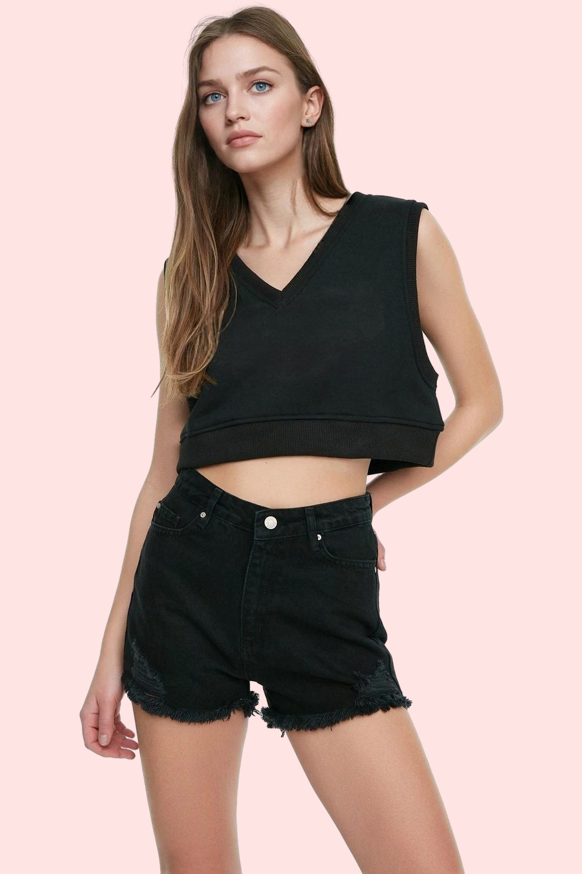 Bu sezonun en trend parçası olan siyah denim şortumuzla tanışın! Yüksek belli ve mini boy yapısıyla dikkat çeken şort, rahatlığı ve şıklığı bir arada sunuyor. %100 pamuktan üretilen kumaş, gün boyu konfor sağlar. Yırtık detaylar, şorta modern ve edgy bir hava katarken, düz desen ve straight kalıbıyla her vücut tipine mükemmel uyum sağlar.