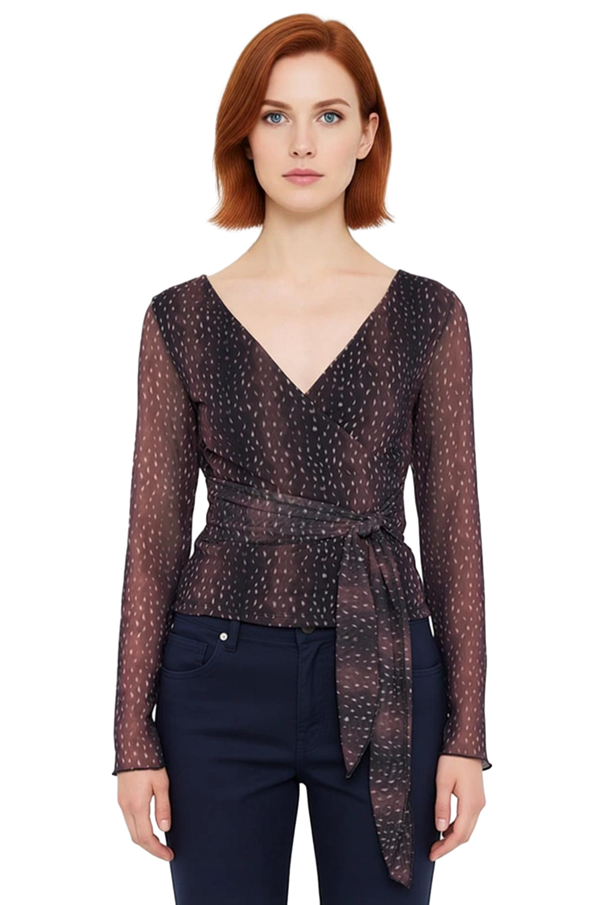 Kadınlar için özel olarak tasarlanmış bu anvelop bluz, modern ve şık bir görünüm arayanlar için idealdir. V yaka kesimi, zarif bir dekolte sunarken, uzun kollu tasarımı her mevsim kullanımına uygunluk sağlar. Bluzun örme kumaşı, yumuşak dokusuyla gün boyu konfor sunar. Üzerindeki desen, ürüne özgün bir karakter katarken, anvelop kesimi vücudu sararak feminen bir siluet oluşturur. Beldeki bağlama detayı, bluzun kişiye özel olarak ayarlanabilmesine olanak tanır, böylece her vücut tipine mükemmel uyum sağlar. Bu bluz, hem gündüz şıklığı hem de gece davetleri için uygun bir seçenektir. Jean pantolonlar, kalem etekler veya kumaş pantolonlarla kolayca kombinlenebilir. Polyester ve elastan karışımı, kumaşın hem dayanıklı hem de esnek olmasını sağlar, bu da uzun süreli kullanım ve rahatlık anlamına gelir. Kış sezonu için tasarlanan bu bluz, Türkiye’de üretilmiştir. Astarlı yapısı, ekstra bir katman konfor ve örtücülük sunar. Bu bluz, gardırobunuza sofistike bir dokunuş katacak ve her zaman şık görünmenizi sağlayacaktır. Bağlama detayı, bluzun stilini kişiselleştirmenize olanak tanır, bu da onu daha da özel kılar.