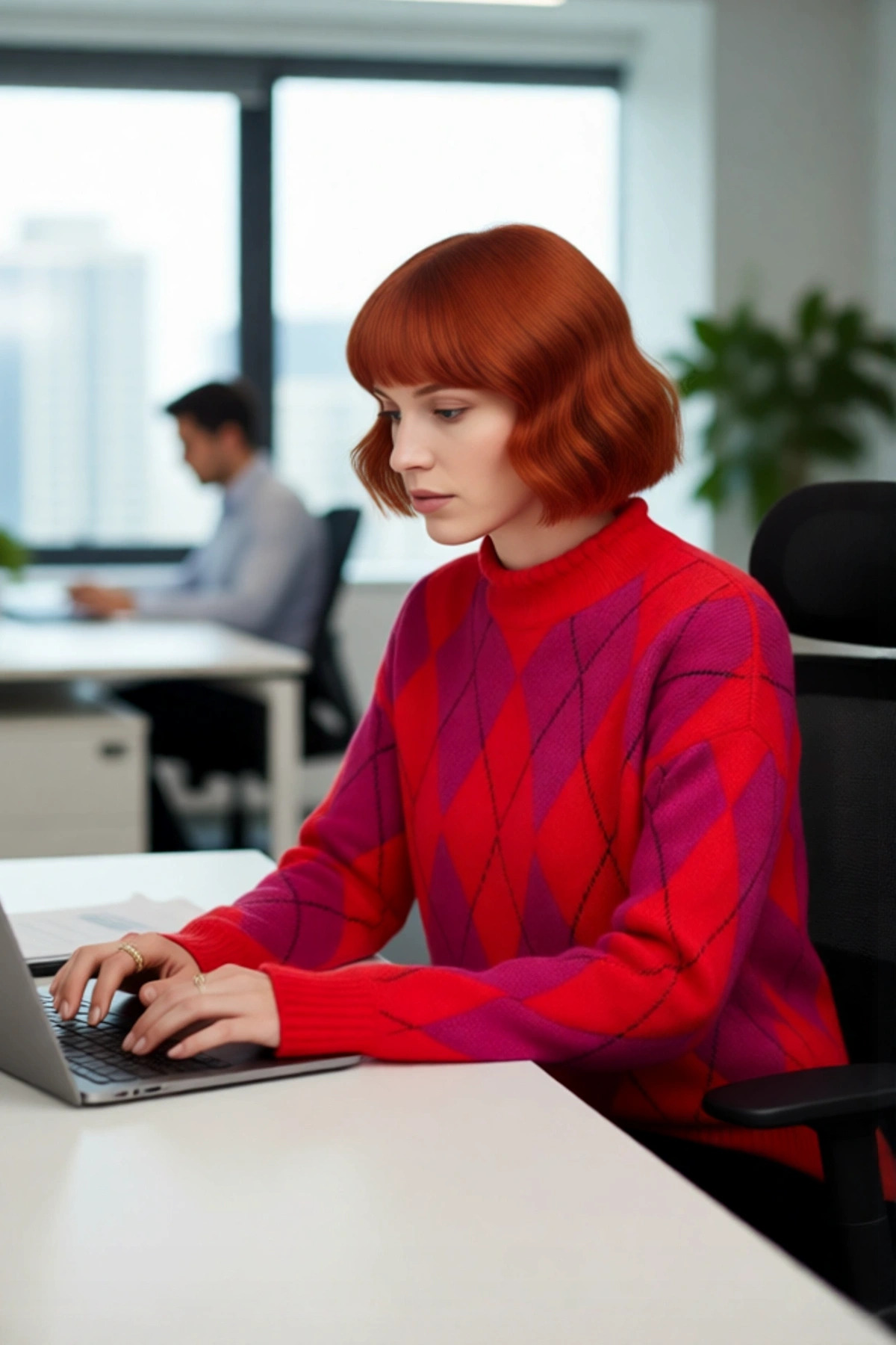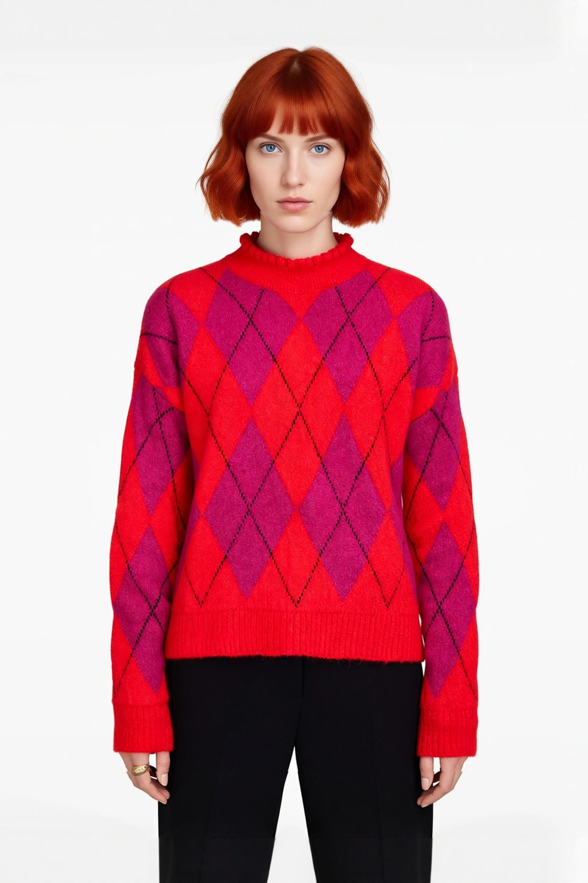 Soğuk kış günlerinde stilinizi ve konforunuzu bir arada sunan bu kadın triko kazak, oversize kalıbı ile hareket özgürlüğü sağlar. 80% akrilik ve 20% polyester materyal bileşimi sayesinde cildinize narin bir dokunuş sunarken, orta kalınlığıyla optimum sıcaklık seviyesini korur. Enerjik kırmızı ve mor renklerin birleştiği baklava deseni, klasik bir motifi modern bir yorumla sunarak şıklığınızı tamamlar. Casual ve günlük kullanım için mükemmel bir tercihtir.