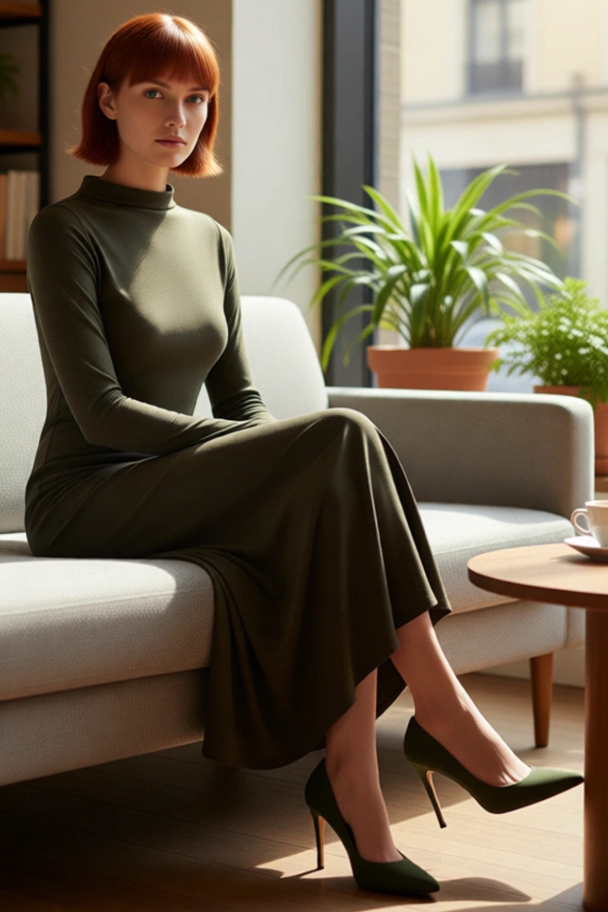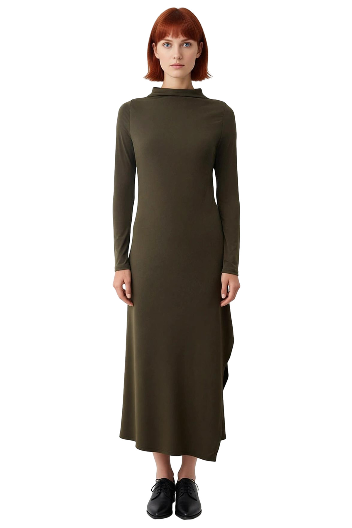 Ürün Özellikleri: Asimetrik kalıp, polyester elastan materyal, düz desen, dik yaka, standart kol, örme kumaş, haki renk.