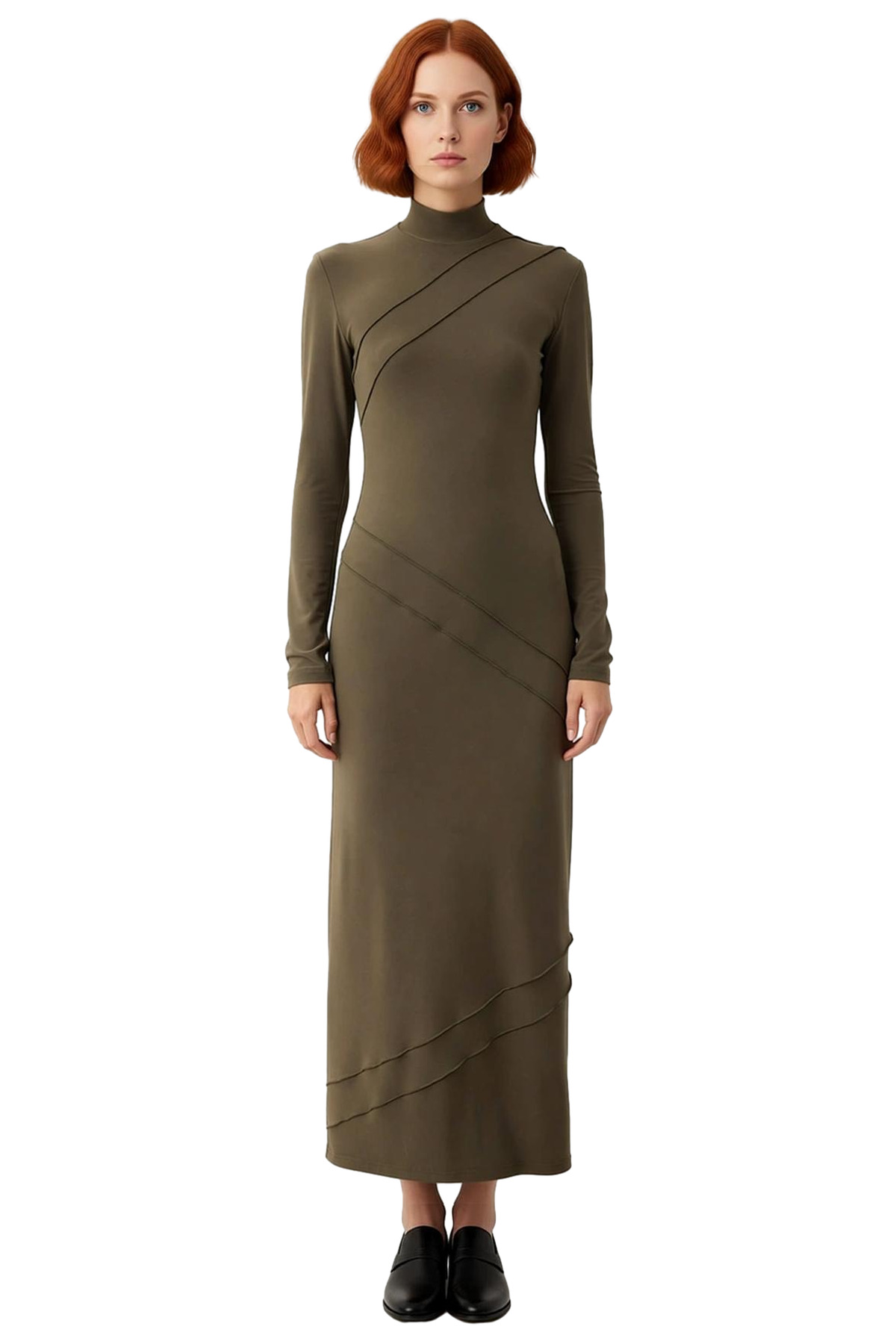 Kış sezonunun vazgeçilmezi olacak bu kadın maxi elbise, bodycon kalıbıyla vücut hatlarınızı nazikçe sarar ve size Cool & Comfort bir deneyim sunar. %96 polyester ve %4 elastan materyal bileşeni sayesinde esneklik ve rahatlık sağlarken, kalın sandy dokuma tipi ile soğuk havalarda bile sıcak kalmanızı garanti eder. Haki rengi ve düz deseni, asimetrik siluet detayları ve karyoka dikişleriyle modern ve özgün bir tarz ortaya koyar.