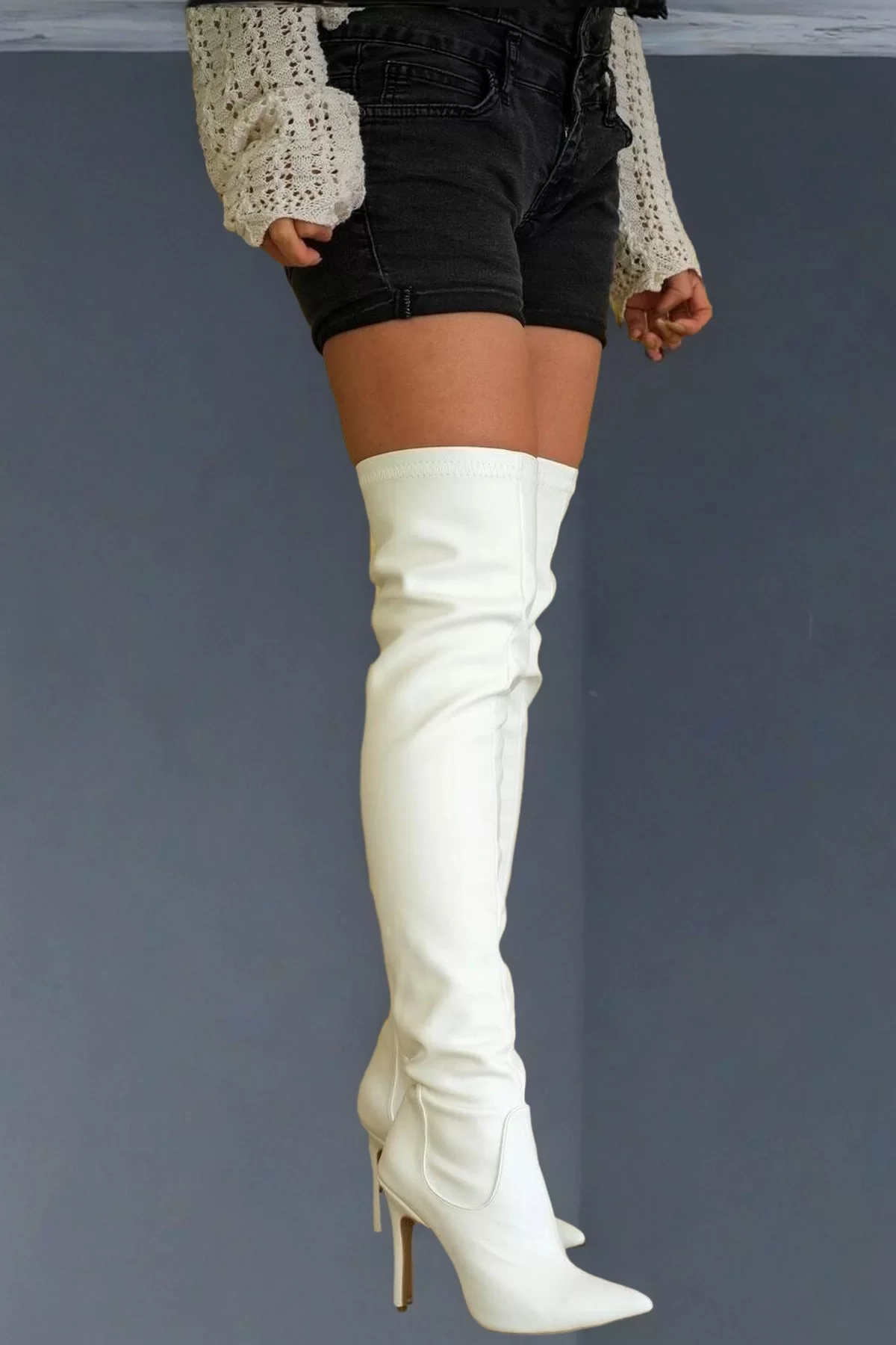 Kadın Diz Üstü Deri Detaylı Stiletto Çizme Sivri Burun İnce Topuk Model - Görsel 3