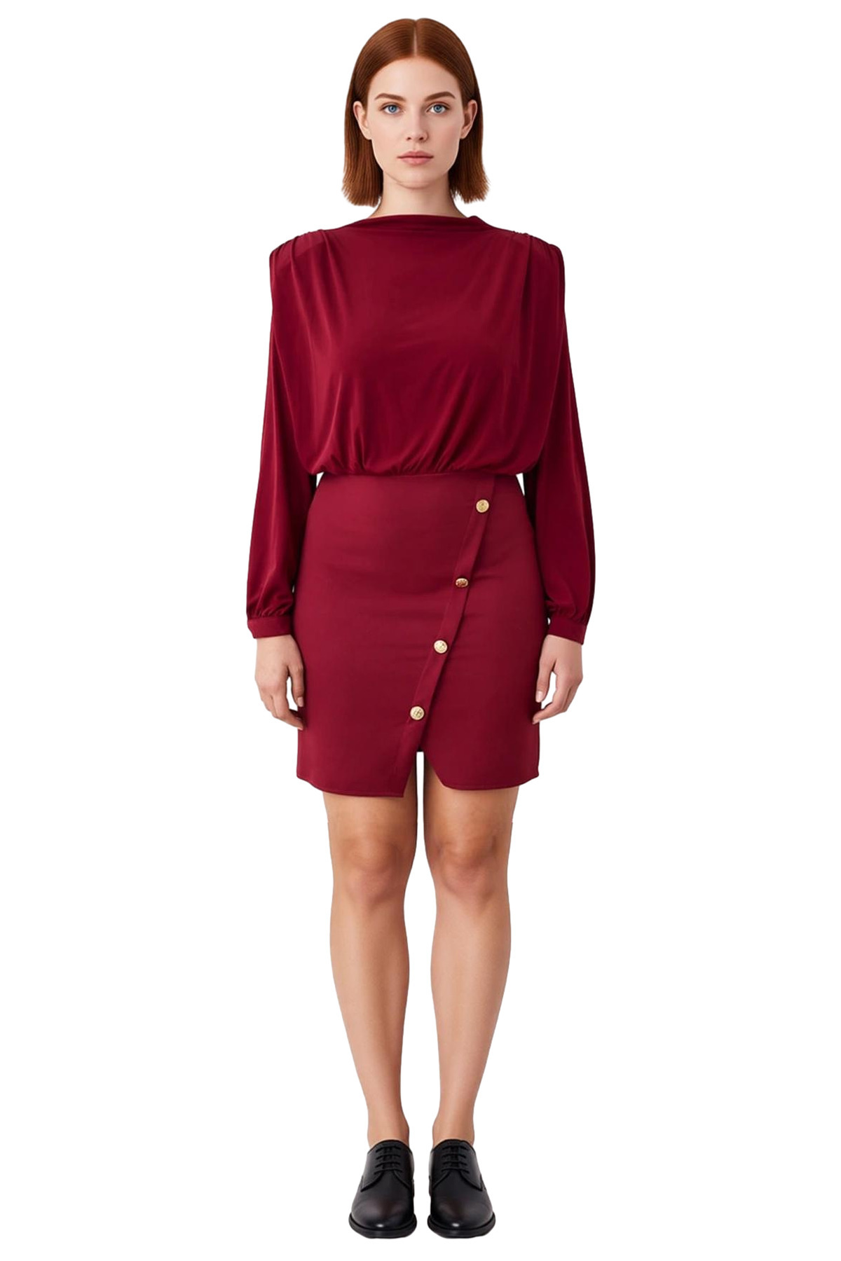 Ürün Özellikleri: A-line kalıp, polyester elastan materyal, düz desen, dik yaka, balon kol, dokuma kumaş, bordo renk, mini boy.