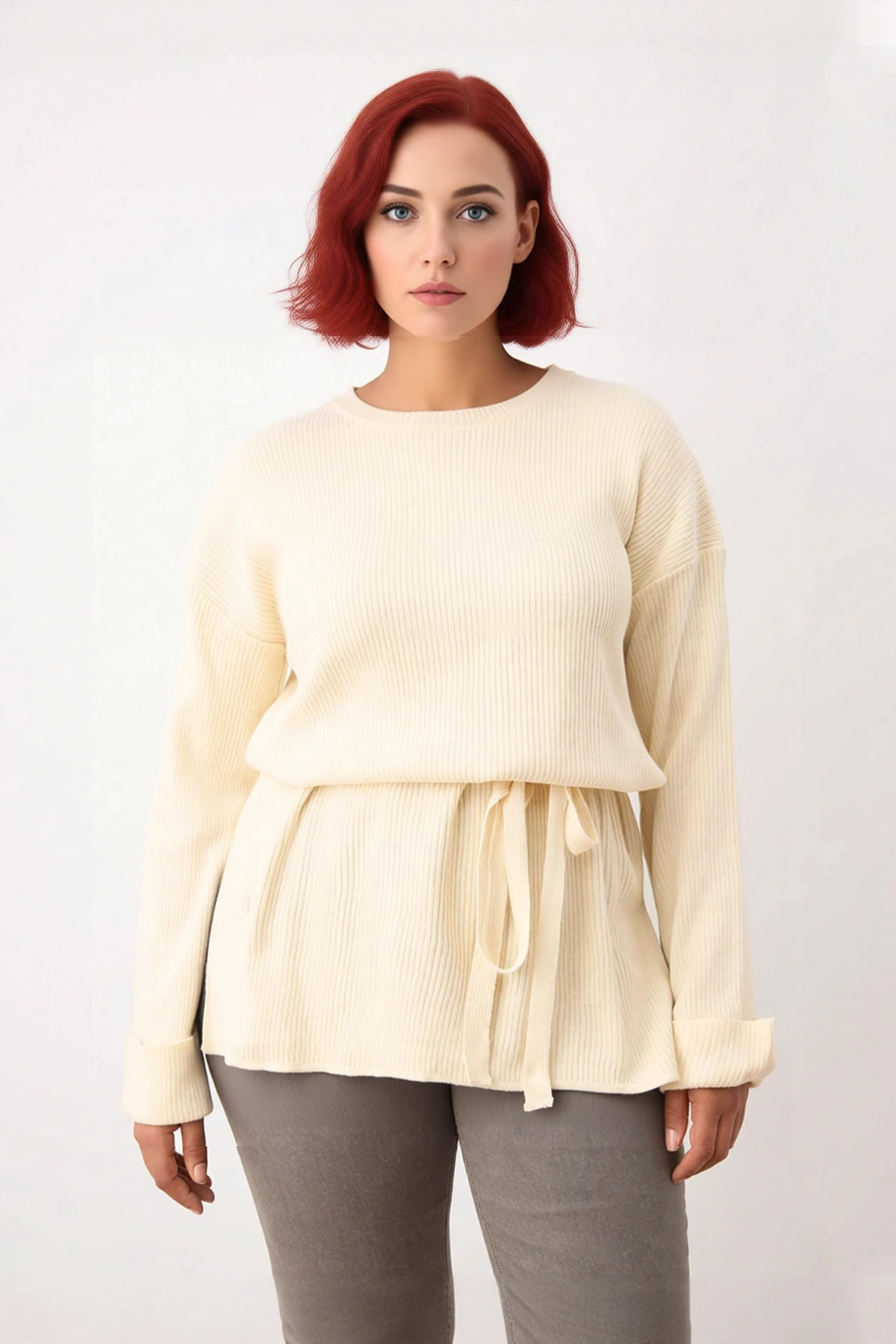Ürün Özellikleri: Relaxed kalıp, %100 akrilik materyal, düz desen, bisiklet yaka, düşük kol, triko kumaş, ekru renk.