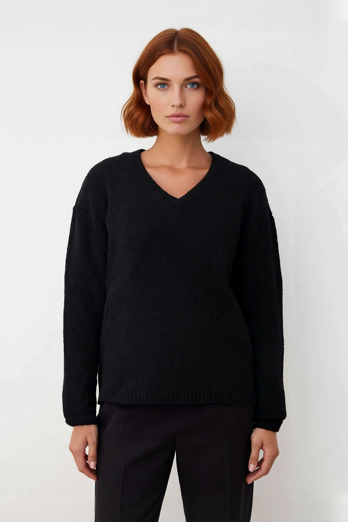 Kadınlar için tasarlanan bu V Yaka triko kazak, regular kalıbıyla gün boyu süren konforu ve modern bir şıklığı bir araya getiriyor. %53 polyester ve %47 pamuğun eşsiz harmanından oluşan materyal bileşeni, kış aylarında sizi sıcacık tutarken cildinize nazik bir dokunuş vaat eder. Düz deseni ve klasik siyah rengi sayesinde kolayca kombinlenebilir ve Cool & Comfort tarzını benimseyenler için idealdir. Bu kazak, sade ve zarif tasarımıyla her anınızda size eşlik etmeye hazır.