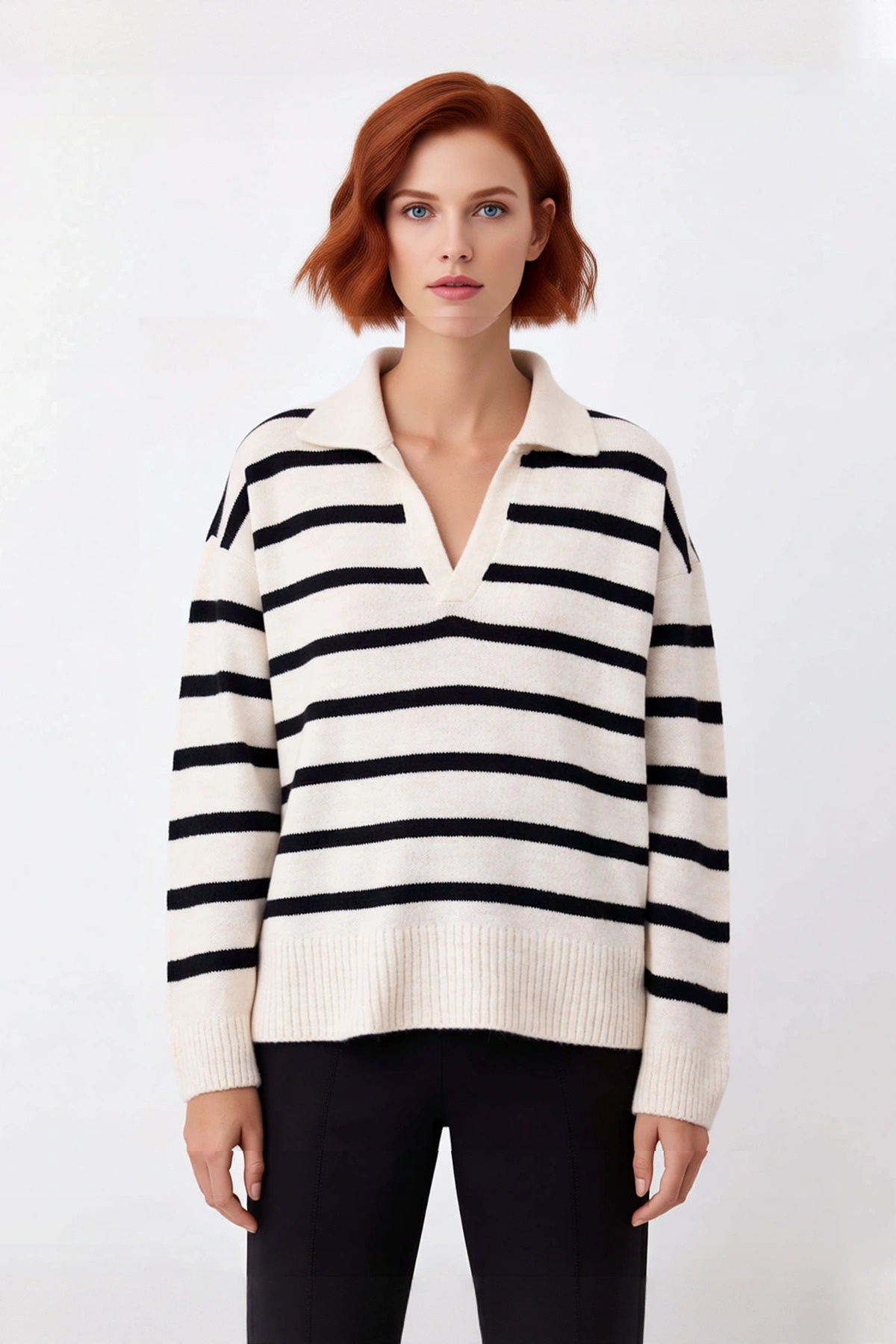 Ürün Özellikleri: Oversize kalıp, akrilik ve polyester materyal, çizgili desen, polo yaka, düşük kol, triko kumaş, ekru renk, orta kalınlık, uzun boy, tek plaka dokuma.
