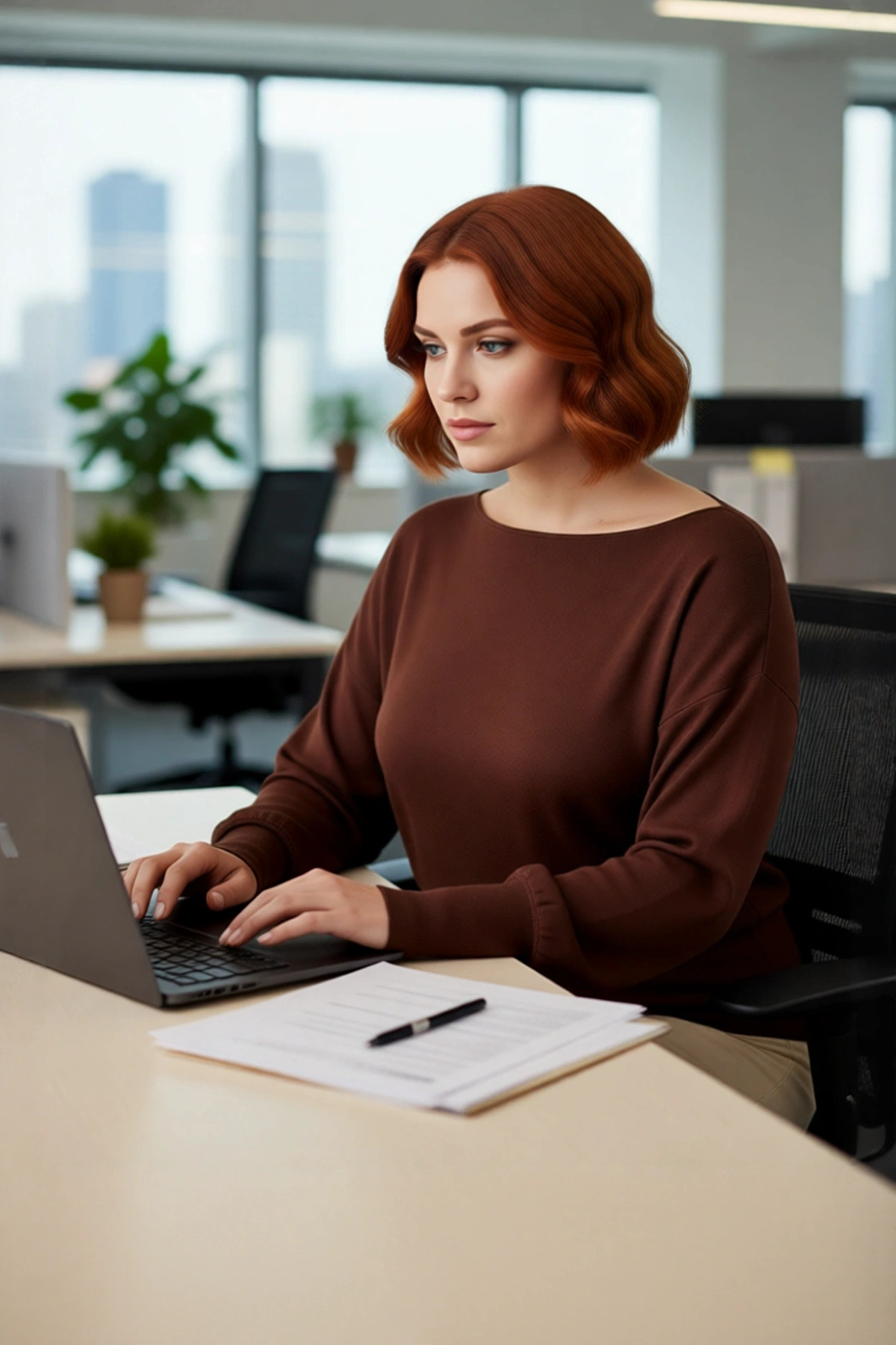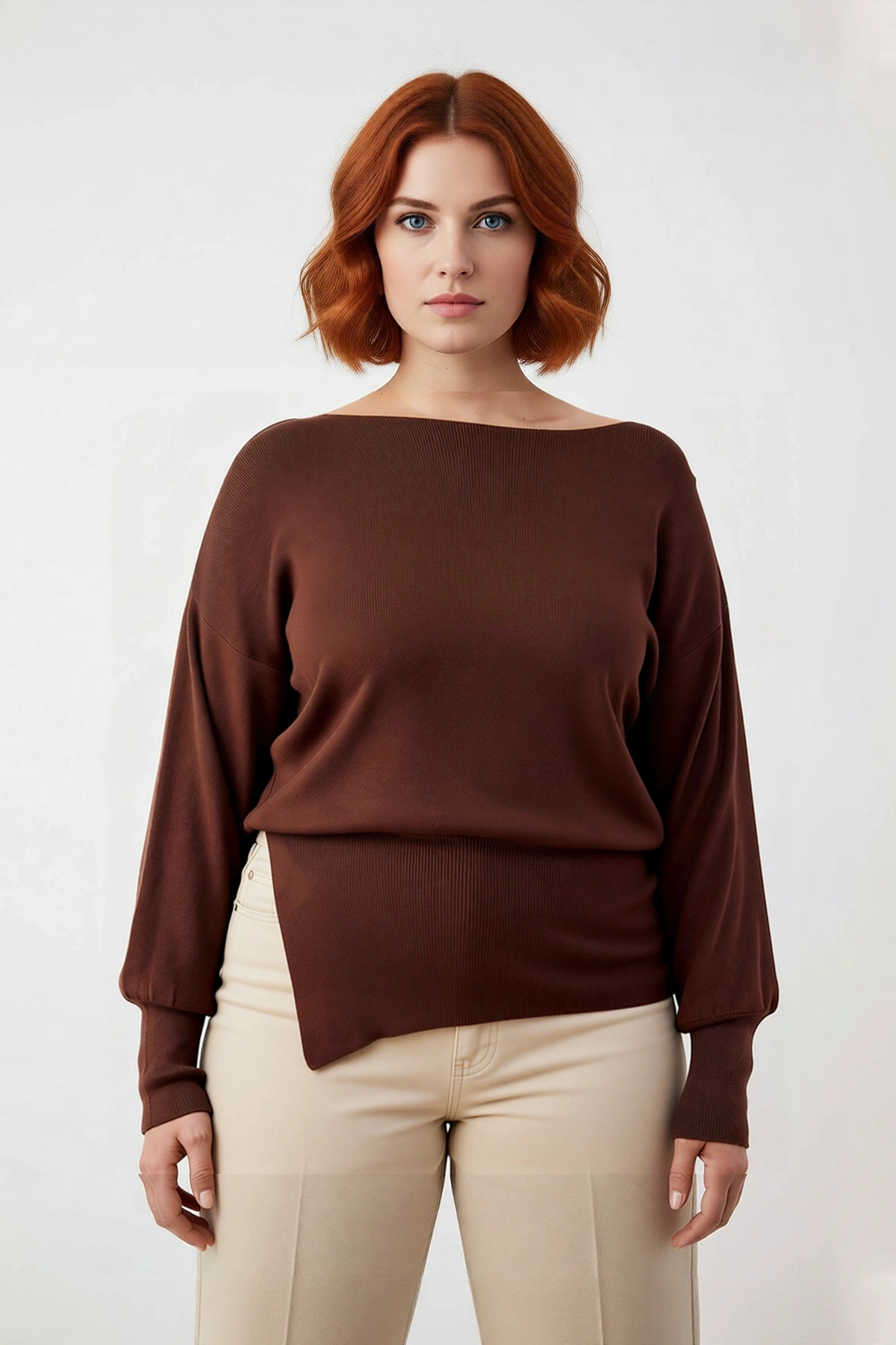 Ürün Özellikleri: Regular kalıp, viskoz akrilik materyal, düz desen, kayık yaka, düşük kol, triko kumaş, kahverengi renk, asimetrik kesim.