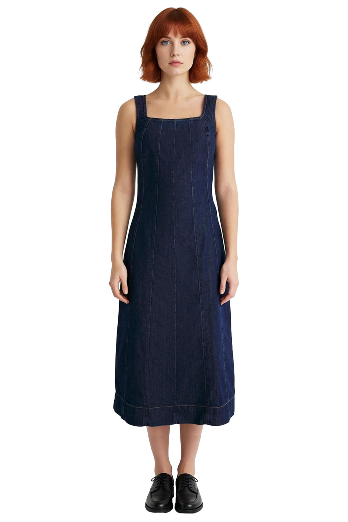 Ürün Özellikleri: Bodycon kalıp, denim materyal, düz desen, kare yaka, kolsuz, rigid kumaş, lacivert renk.