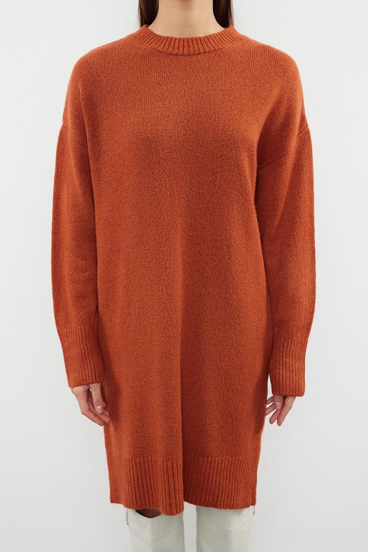 Bisiklet yaka tasarımı, boyun bölgenizi nazikçe sararak sıcak tutar ve klasik bir dokunuş katarken, düşük omuzlu uzun kol yapısı modern ve rahat bir siluet oluşturur. Orta kalınlıktaki triko kumaşı, tek plaka dokuma tekniğiyle üretilmiş olup, soğuk havada bile yeterli ısı yalıtımı sağlar. Cepsiz, astarsız ve kemersiz tasarımı, elbisenin akışkan ve sade yapısını ön plana çıkarır. Makinede kolayca yıkanabilir olması (T41 yıkama talimatı), bakımını pratik hale getirerek yoğun temponuzda size zaman kazandırır.