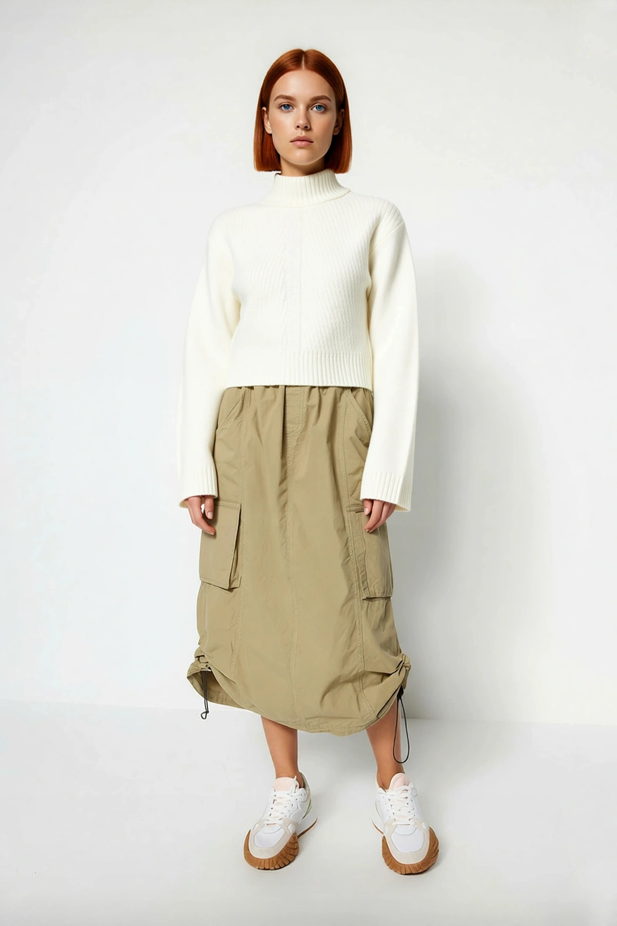 Ürün Özellikleri: Regular kalıp, akrilik materyal, düz desen, dik yaka, balon kol, triko kumaş, ekru renk, crop boy.