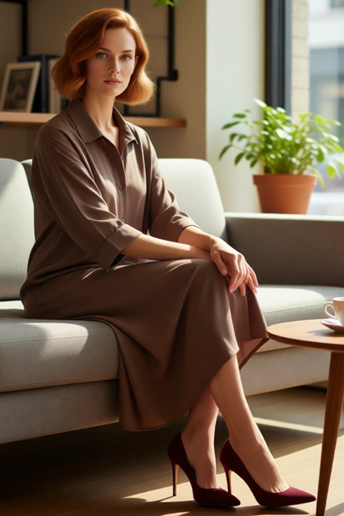 Ürün Özellikleri: Gömlek Elbise kalıp, Modal Polyester karışım materyal, düz desen, gömlek yaka, truvakar kol, dokuma kumaş, kahverengi renk, düğmeli tasarım.