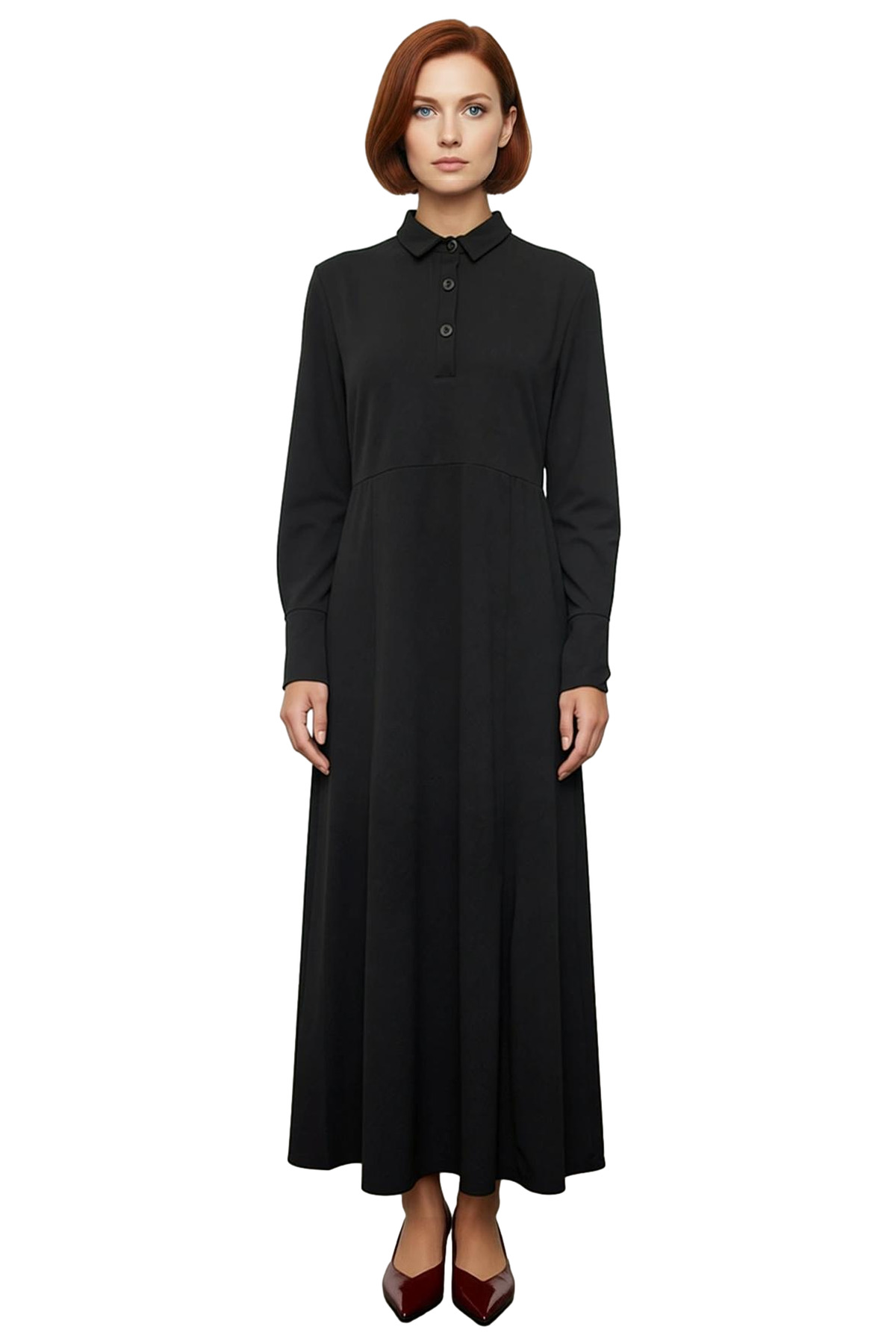 Elbisenin gömlek yaka detayı, elbiseye klasik bir zarafet katarken, ön kısmında yer alan düğmeli tasarım kolay giyim imkanı sunar ve stilinize modern bir dokunuş ekler. Uzun standart kol boyu, kış aylarında sıcak tutarken, her türlü dış giyimle mükemmel uyum sağlar. Örme kumaş yapısı ve astarsız olmasına rağmen tok duruşuyla iç göstermeyen bu elbise, dalgıç dokuma sayesinde kırışmaya karşı dirençlidir ve bakımı oldukça pratiktir. Kaliteli işçilikle üretilmiş bu parça, uzun yıllar boyunca gardırobunuzda yerini koruyacaktır.