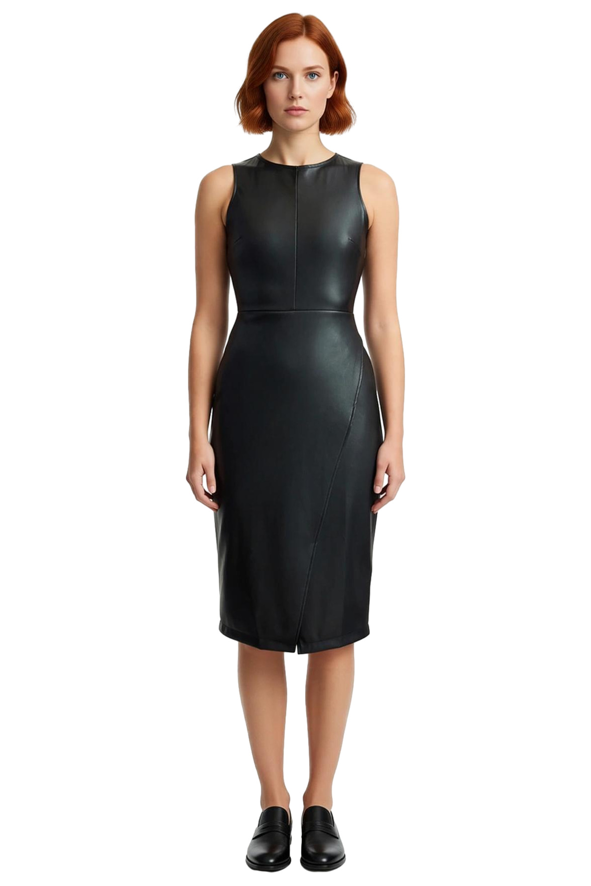 Ürün Özellikleri: Bodycon kalıp, suni deri materyal, düz desen, bisiklet yaka, kolsuz, örme kumaş, siyah renk, yırtmaçlı detay.