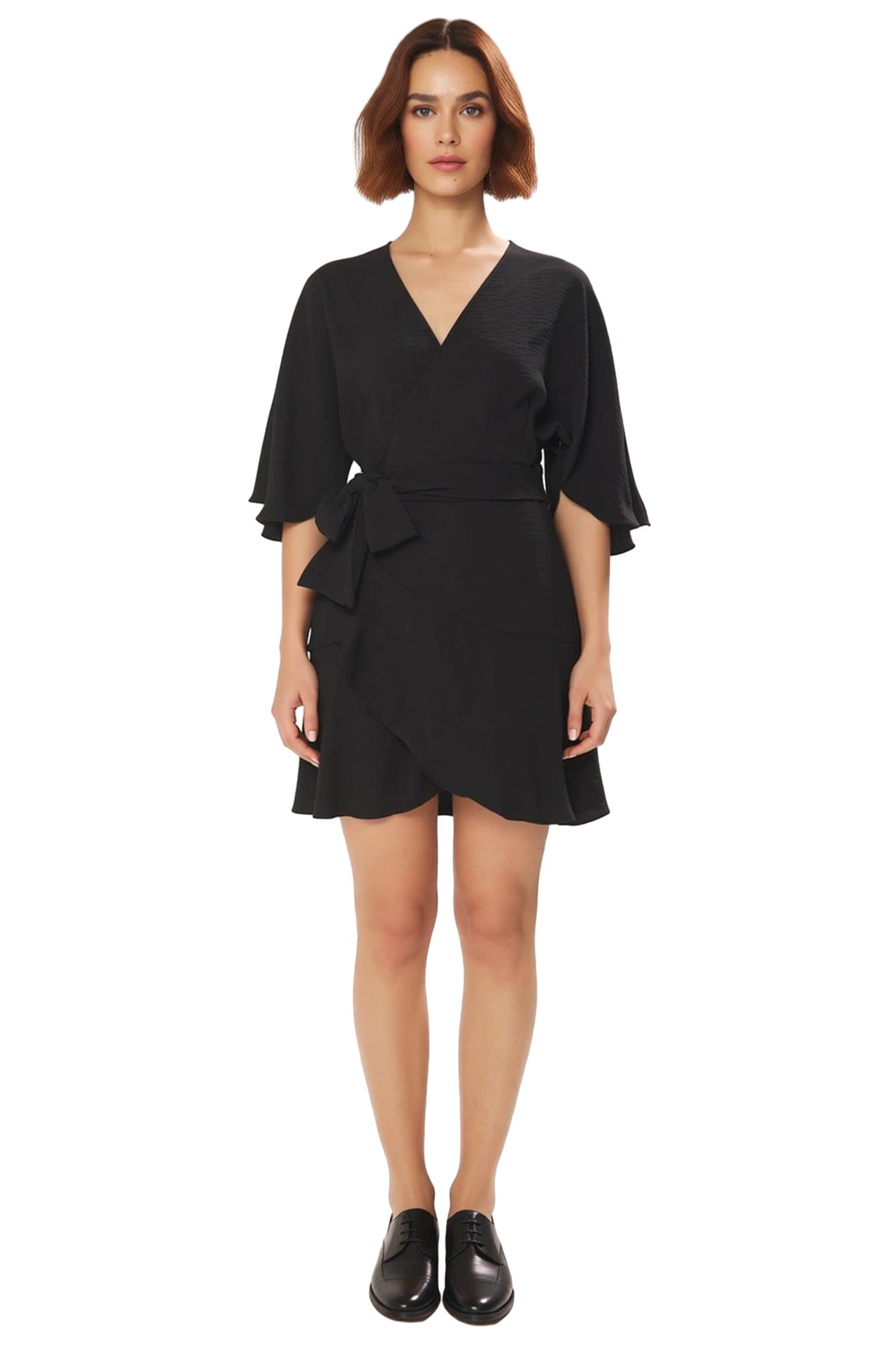 Ürün Özellikleri: Skater kalıp, polyester materyal, düz desen, V yaka, yarasa kol, dokuma kumaş, siyah renk, kruvaze kapama, kuşaklı tasarım.