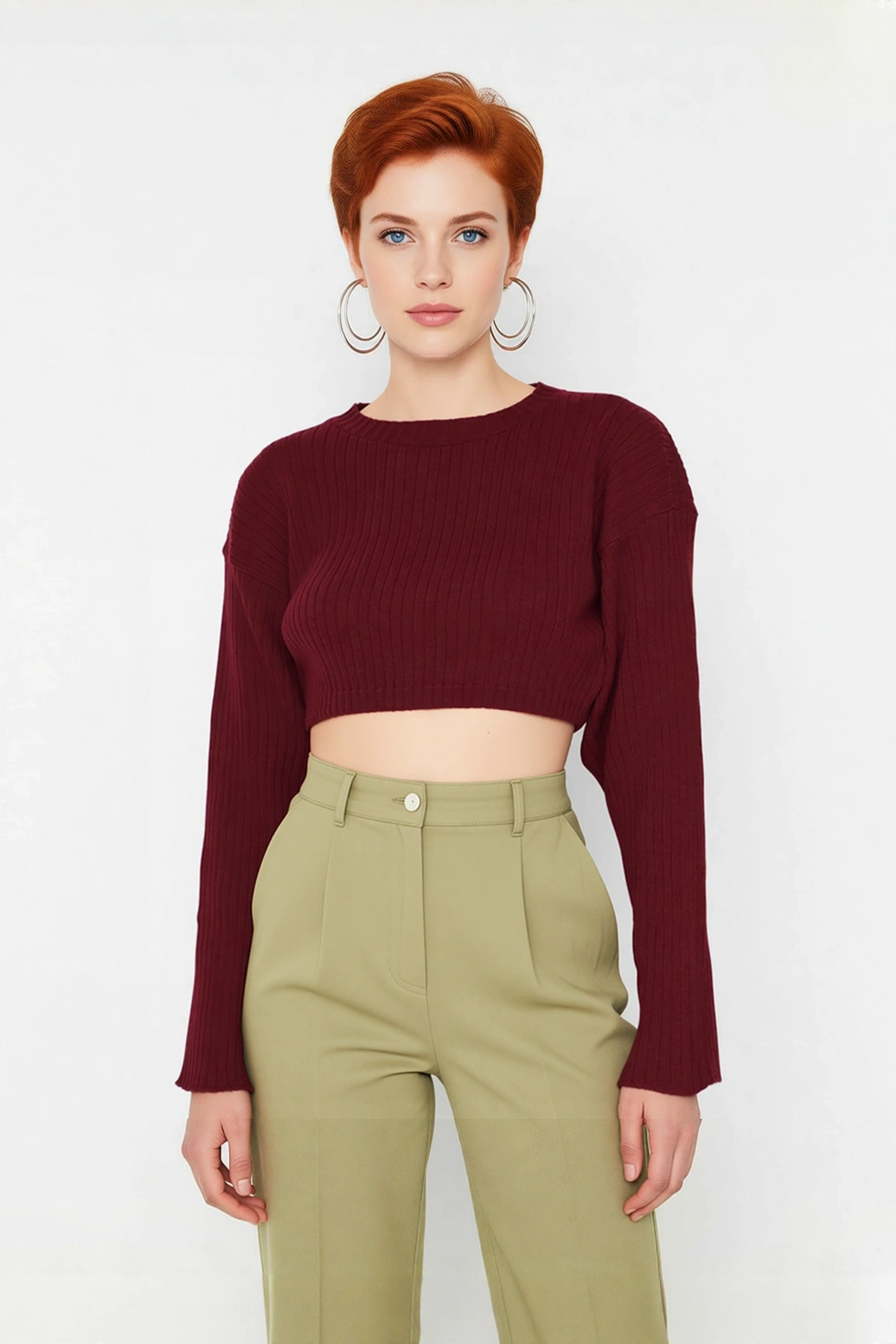 Ürün Özellikleri: Regular kalıp, akrilik materyal, düz desen, bisiklet yaka, standart kol, triko kumaş, bordo renk.