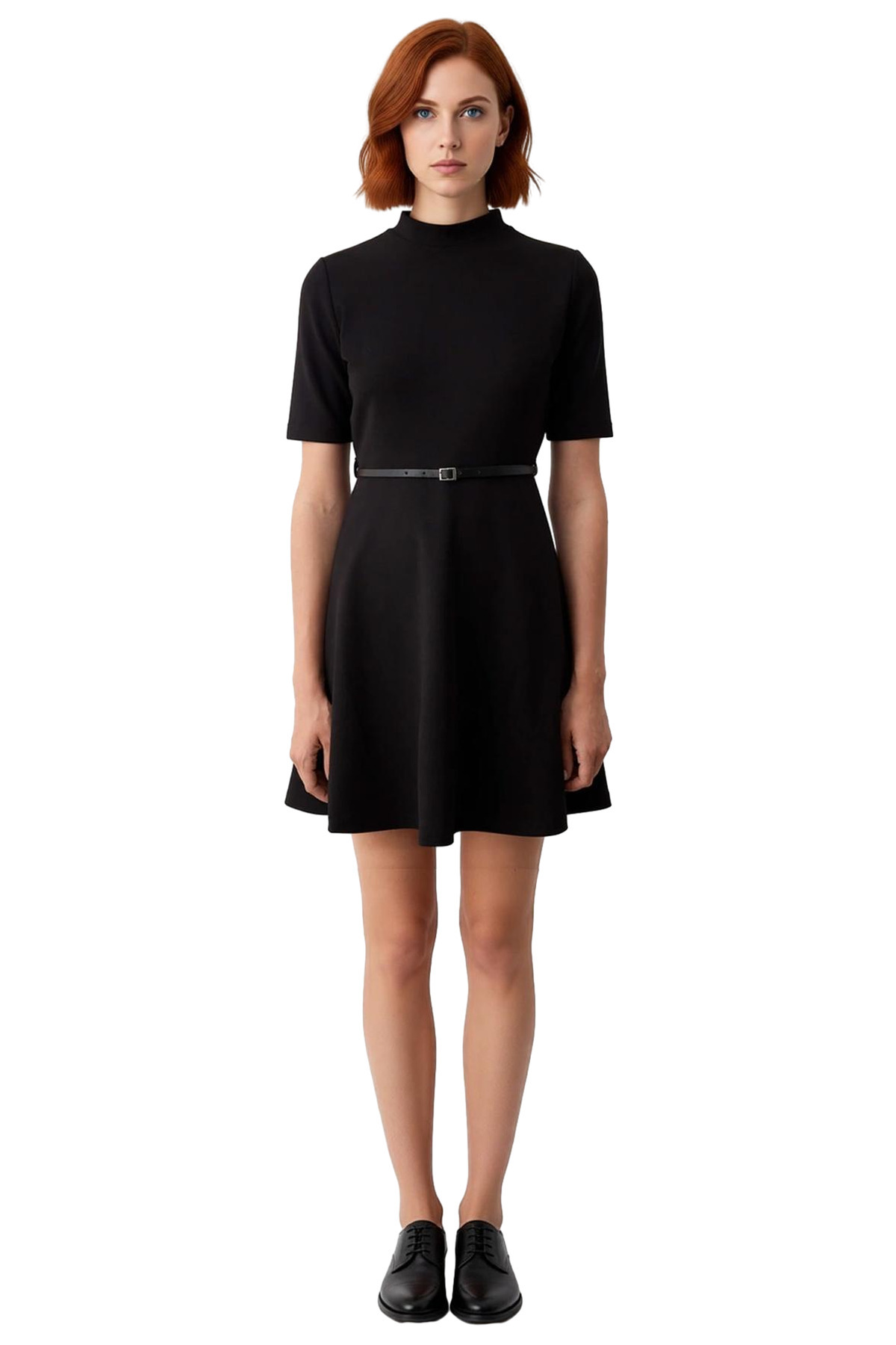 Ürün Özellikleri: Skater kalıp, polyester materyal, düz desen, dik yaka, kısa kol, örme kumaş, siyah renk, kemerli detay.