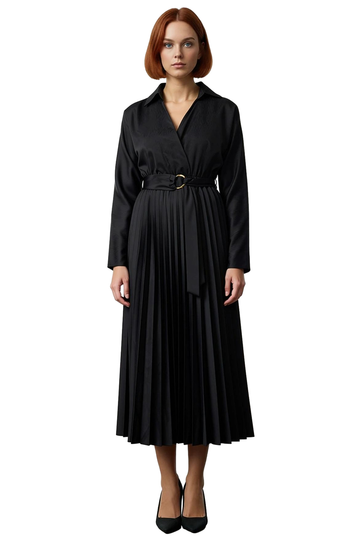 Ürün Özellikleri: Skater kalıp, polyester materyal, düz desen, ceket yaka, uzun standart kol, dokuma crinkle kumaş, siyah renk, piliseli etek, kuşaklı, astarsız, cepsiz.