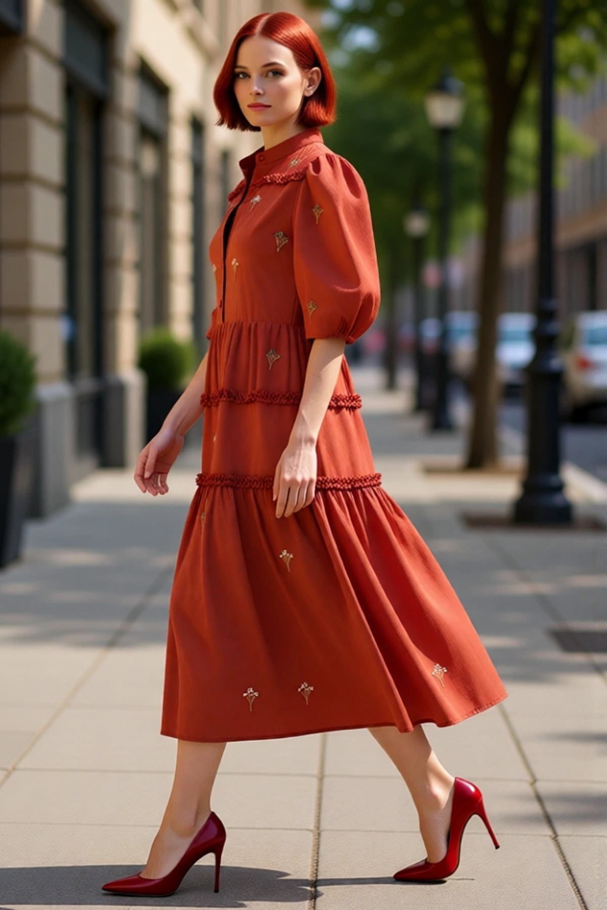 Bu kadın elbisesi, düz kesim ve shift silueti sayesinde gün boyu süren maksimum konfor ve stil sahibi bir görünüm sunar. Yüksek kaliteli terrycotton dokuma kumaşı, polyester ve pamuk karışımıyla hem dayanıklılık hem de nefes alabilirlik sağlayarak cildinize narin bir dokunuş sunar. Elbisenin üzerindeki zarif nakış detayları, sade düz desene hareket katarak ilkbahar ve sonbahar mevsimleri için ideal, şık ve feminen bir hava yaratır. Kiremit rengi ile sıcak ve davetkar bir atmosfer sunar.