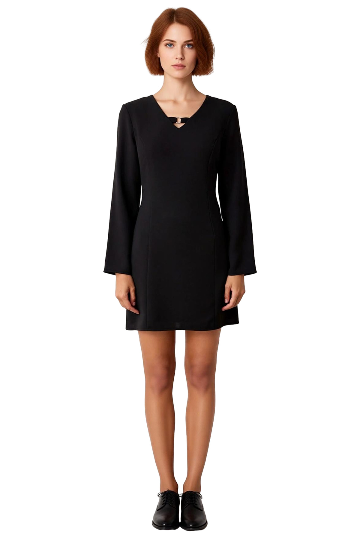 Modern kadının gardırobuna zarafet katacak bu siyah düz kesim shift elbise, aksesuar detaylı V yakasıyla öne çıkıyor. İş ve özel davetler için ideal olan bu parça, %100 polyester krep dokuma kumaşı sayesinde gün boyu konfor ve şıklığı bir arada sunar. Uzun kollu tasarımı ve kış sezonuna uygun materyaliyle soğuk havalarda bile stilinizden ödün vermeyeceksiniz. Astarsız yapısı hafif ve dökümlü bir siluet sağlarken, shift kalıp kesimi her vücut tipine uyum sağlayarak rahat bir kullanım sunar. Bu elbise, profesyonel görünümünüzü tamamlayacak ve size özgüven katacak.