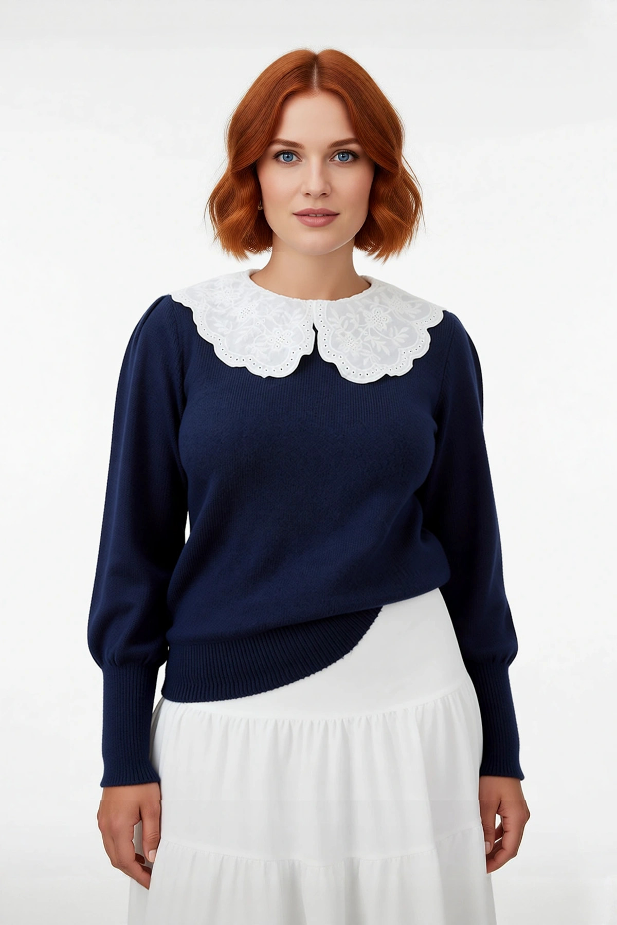 Kadın Düz Lacivert Triko Kazak Dantel Gömlek Yaka Detaylı Uzun Kollu Kış Gardırobunuzun Vazgeçilmezi
