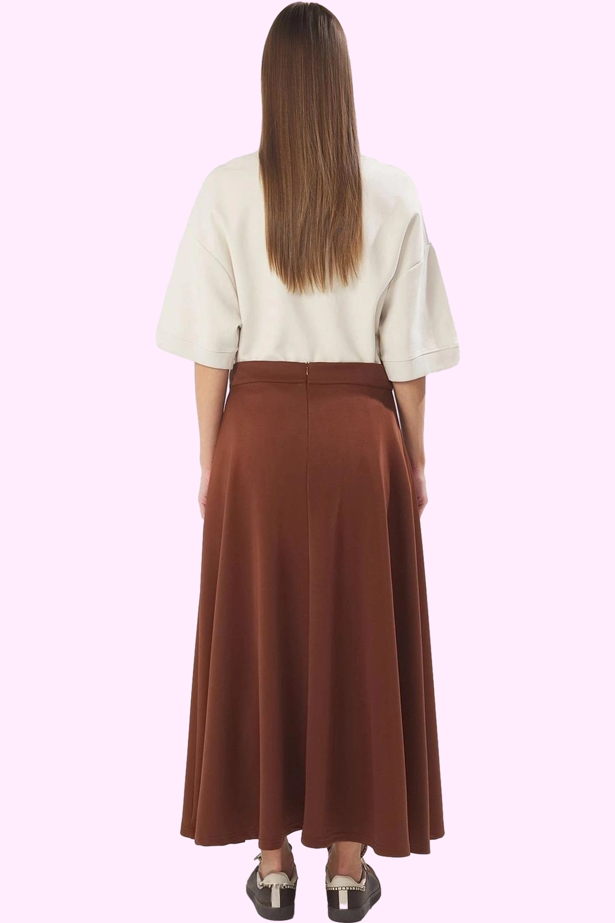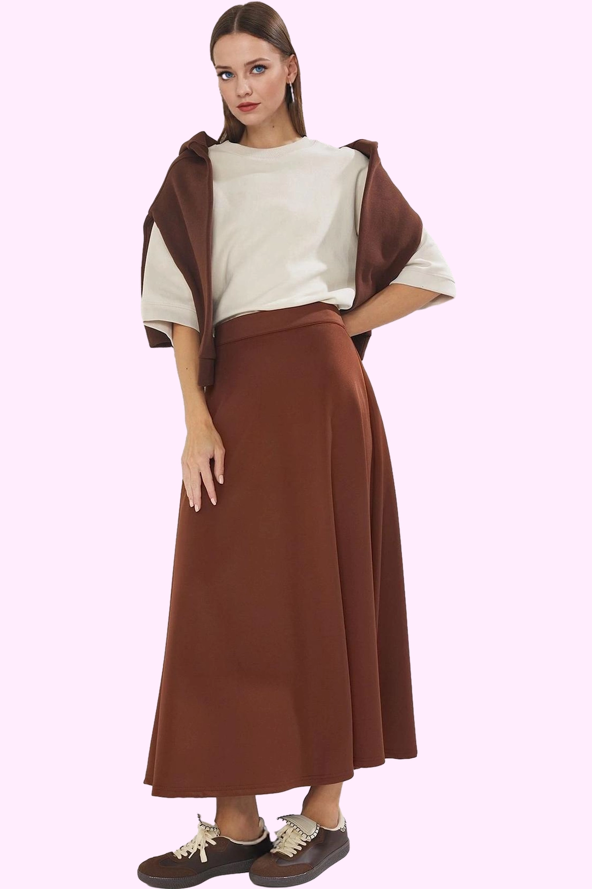 Bu zarif ve rahat kadın eteği, günlük stilinizi tamamlamanız için mükemmel bir seçenektir. Yumuşak örme kumaştan üretilen etek, gün boyu konforlu bir kullanım sunar. Düz ve şık tasarımı ile her kıyafetinizle uyum sağlayacak, zamansız bir parçadır. Midi boyu ve kloş kesimiyle her vücut tipine mükemmel uyum sağlar. Kahverengi rengi ile her türlü mevsim kombinlerinize uyum sağlayabilir.