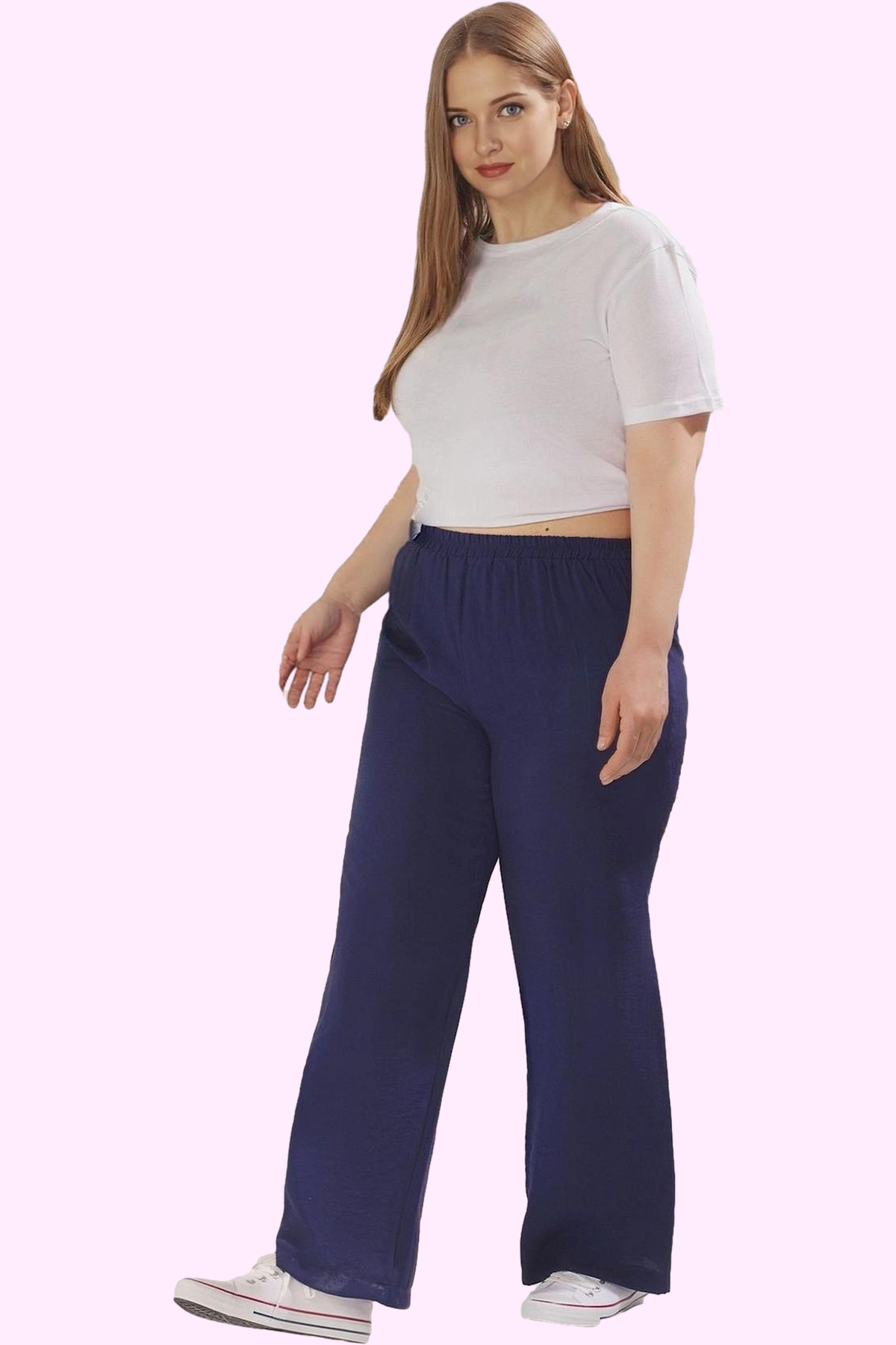 Günlük yaşamınızda hem şık hem de rahat hissetmek ister misiniz? O zaman bu lacivert yüksek bel pantolon tam size göre! Yumuşak ve nefes alan %85 viskoz ve %15 pamuk karışımı kumaş, gün boyu konfor sunarken, geniş paça tasarımı, modern ve şık bir görünüm sağlar. Yüksek beli, vücut hatlarınızı güzel bir şekilde ortaya çıkarır ve her kıyafetinizle mükemmel uyum sağlar. Düz desen, zamansız şıklığını her zaman korumanızı sağlar.
