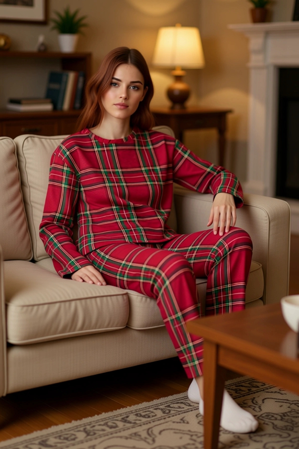 Kadın Ekose Desenli Uzun Kollu Pijama Takımı Fonksiyonel Dayanıklı Kaliteli Konforlu Rahat