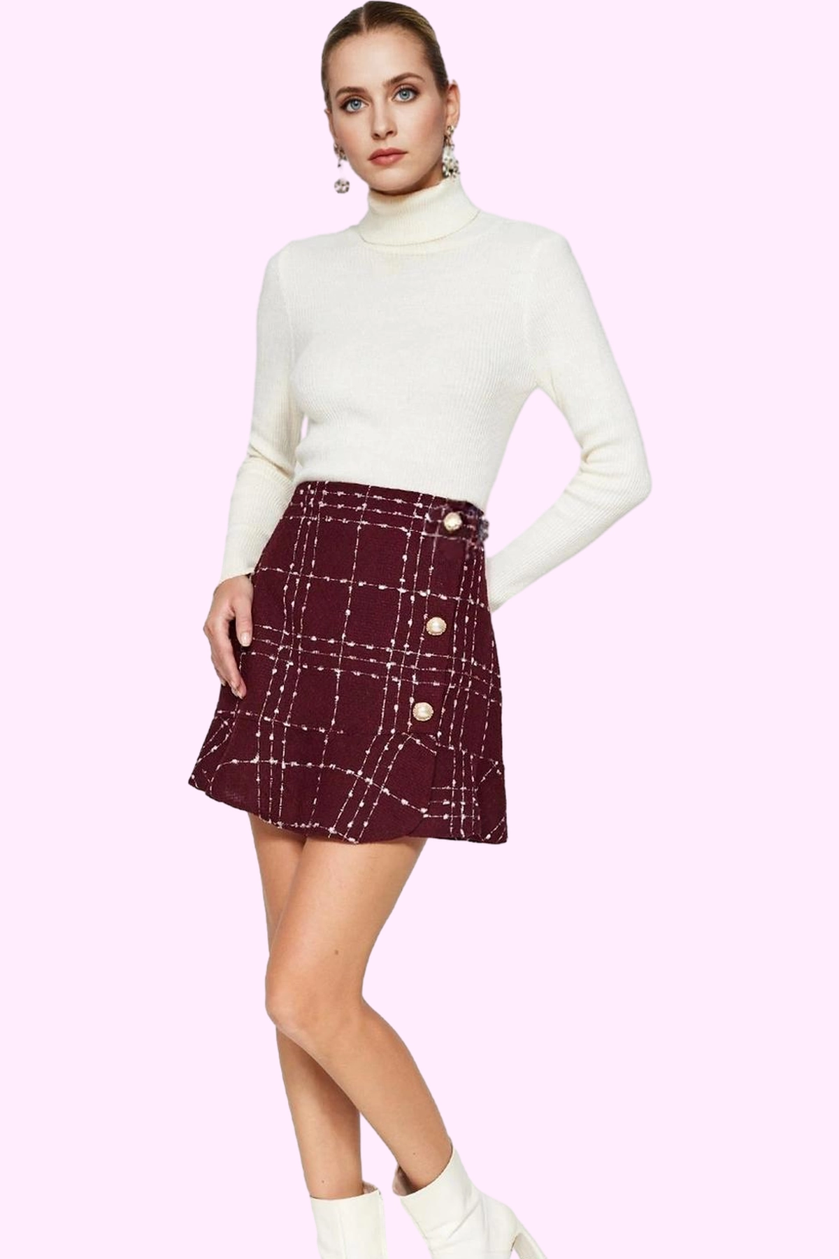 Bu sezonun trendlerinden bordo ekose desenli mini etek ile tarzınıza modern bir dokunuş katın! Yüksek bel tasarımı ve skater kalıbıyla vücut hatlarınızı kusursuz şekilde ortaya koyan bu etek, günlük stilinizi tamamlayacak ideal bir parça. Tüvit kumaş yapısı ile hem şık hem de rahat bir kullanım sunuyor. Kemer detayı ile belinizi ince gösterirken, etek ucu volanları feminen bir hava katıyor. %40 polyester, %38 pamuk, %22 akrilik karışımı kumaştan üretilen etek, dayanıklı ve uzun ömürlü kullanım sağlar.
