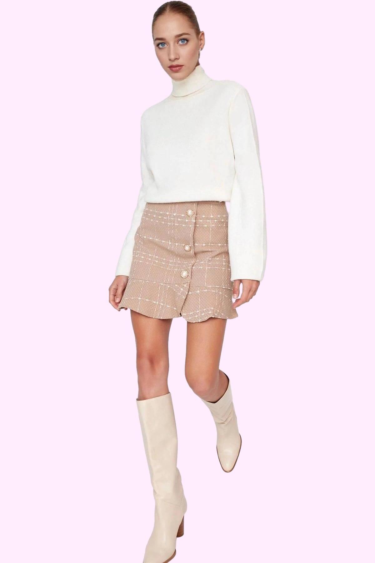 Yüksek kaliteli tüvit kumaş, zarif ekose deseni ve benzersiz detayları ile bu etek, her gardırobun vazgeçilmezi. Skater kalıp, vücut tipinize uyum sağlayarak konforlu bir kullanım sunar. Yüksek bel kesimi, bacaklarınızı daha uzun gösterirken, etek ucu volanları ise hareketli bir görünüm kazandırıyor. Kemerli tasarımı ile belinizi vurgulayarak daha ince görünmenizi sağlar. Günlük kombinlerinizde rahatlıkla kullanabileceğiniz bu etek, çeşitli üstlerle kolayca kombinlenebilir.