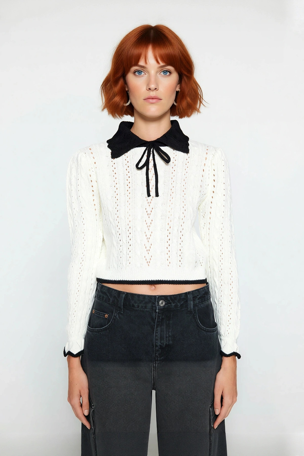 Ürün Özellikleri: Regular kalıp, akrilik materyal, ajurlu desen, polo yaka, standart kol, triko kumaş, ekru/siyah renk, crop boy, ince kalınlık.