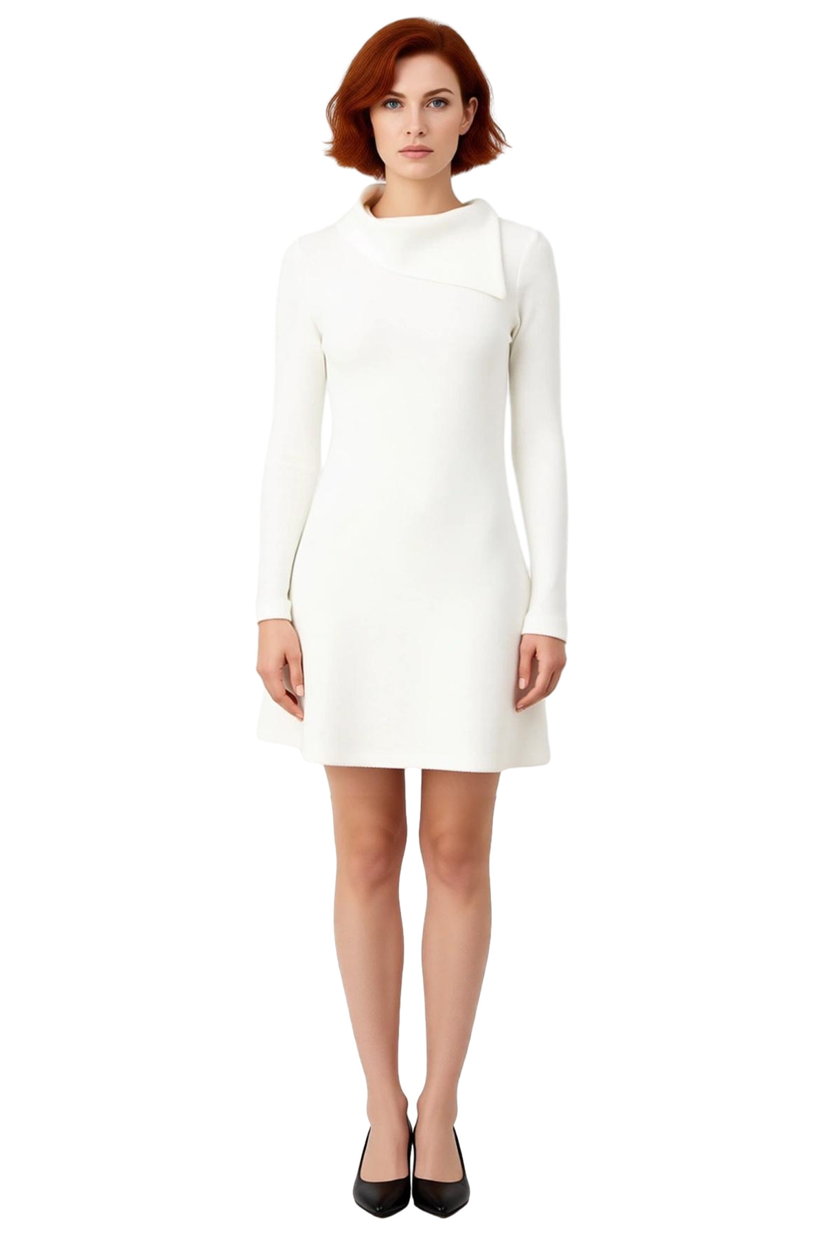 Ürün Özellikleri: A-line kalıp, pamuk polyester karışımı materyal, düz desen, balıkçı yaka, standart kol, örme kumaş, ekru renk, astarsız, mini boy, casual kullanım, kış sezonu.