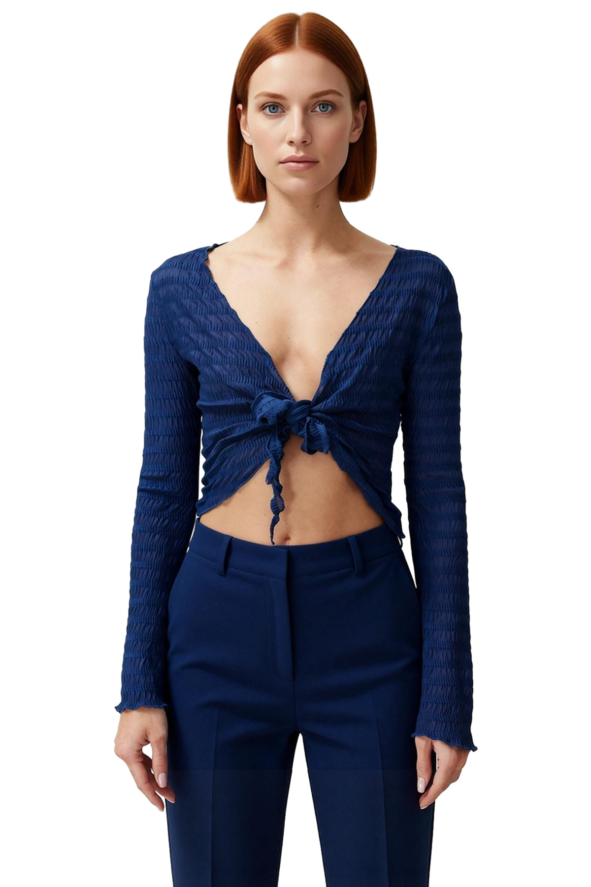 Bu zarif kadın bluzu, benzersiz gofre dokusuyla hem dokusal hem de görsel bir çekicilik sunar. Regular kalıbı, vücut hatlarını nazikçe saran bir uyum sağlarken, polyester karışımlı örme kumaşı yüksek esneklik ve konfor sunar. İnce yapısı ve astarsız tasarımı, özellikle sıcak havalarda ferah bir kullanım imkanı tanır. V yaka ve bağlama detayı, ürüne feminen bir dokunuş katarken, crop boyu modern ve trend bir görünüm vadeder. İspanyol kol detayı, hareket özgürlüğü sağlarken zarif bir estetik sunar.Ürünün düz ve baskısız tasarımı, minimalist bir şıklık arayanlar için idealdir. Cepsiz ve kemersiz yapısı, bluzun sade ve şık çizgisini korur. Bağlama/bağcık kapama şekli, kişisel tercihlere göre ayarlanabilme özelliği sunar ve ürüne dinamizm katar. Asimetrik silueti, kombininize farklı bir boyut katarken, uzun kol boyu her mevsim kullanımına olanak tanır. %98 polyester ve %2 elastan içeren materyal bileşeni, hem dayanıklılığı hem de hareket kabiliyetini artırır. Hassas Yıkama yıkama talimatına uyarak kolayca bakımını yapabilirsiniz.Kadınlar için tasarlanan bu bluz, casual ve günlük ortamlarda rahatlıkla kullanılabilecek bir parçadır. Yüksek bel pantolonlar, jeanler, etekler veya şortlarla mükemmel bir uyum yakalar. Crop kesimi, özellikle yüksek bel altlarla birleştiğinde modern bir siluet oluşturur. Bahar ve yaz aylarında tek başına ferahlatıcı bir seçenekken, serin akşamlarda veya sonbaharda bir ceket veya hırka altına katman olarak da kullanılabilir. Tüm sezonlar için uygun olan bu bluz, stilinize zarif ve feminen bir dokunuş katacaktır. Bu ürün TR menşelidir ve tekli paket içeriğiyle sunulmaktadır.