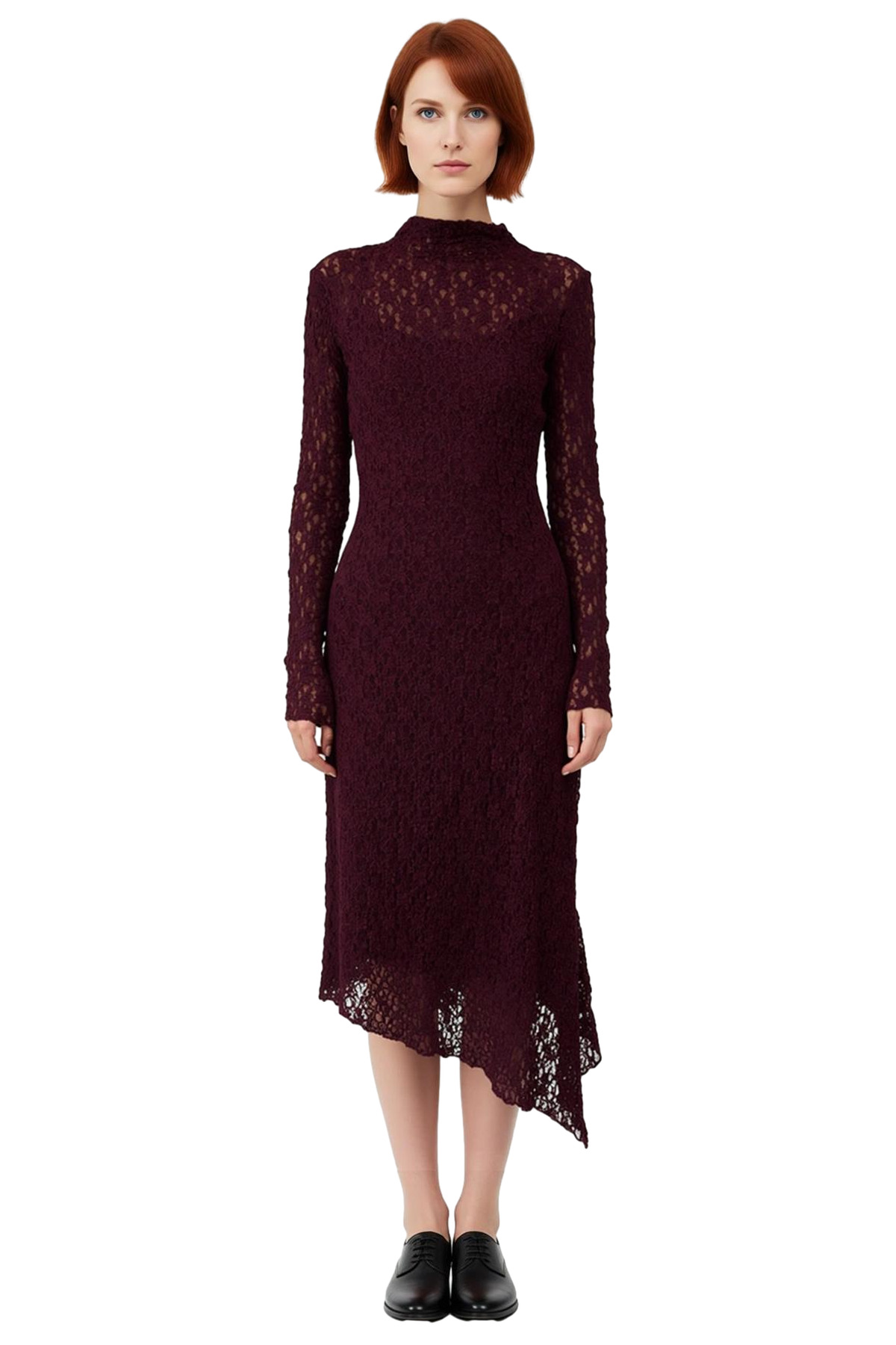 Ürün Özellikleri: Asimetrik kalıp, poliamid elastan materyal, düz desen, dik yaka, uzun kol, örme kumaş, mürdüm renk, astarlı.