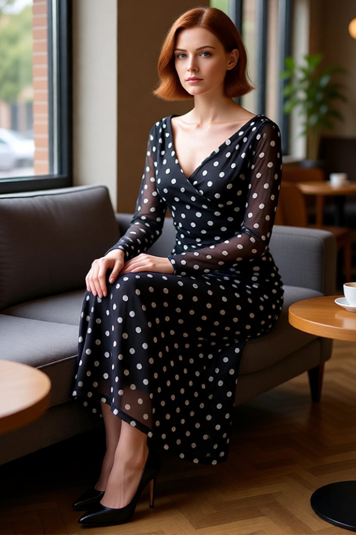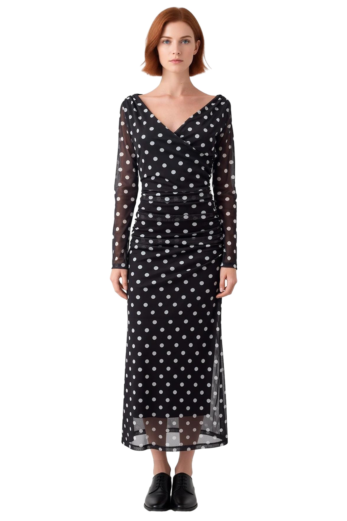 Ürün Özellikleri: Bodycon kalıp, %94 polyester %6 elastan materyal, puantiyeli desen, V yaka, standart uzun kol, tül örme kumaş, siyah renk, büzgü / drape detayı, astarsız.